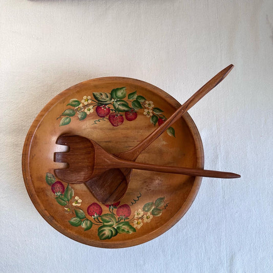 Wooden Hand-painted Bowl w Salad Tongs