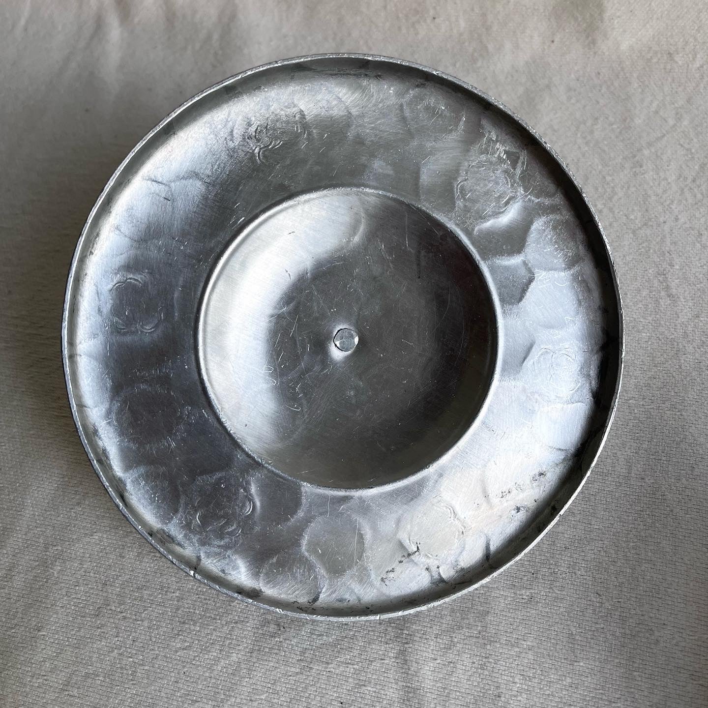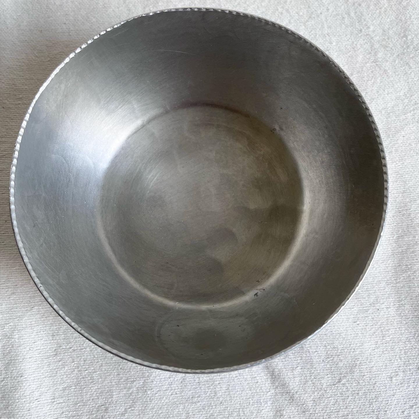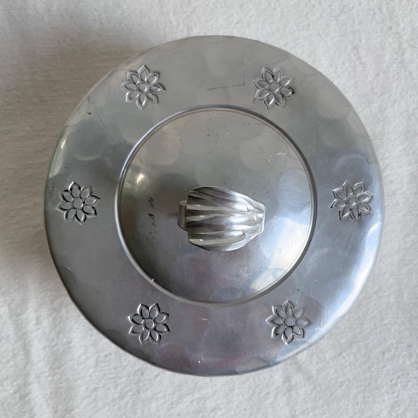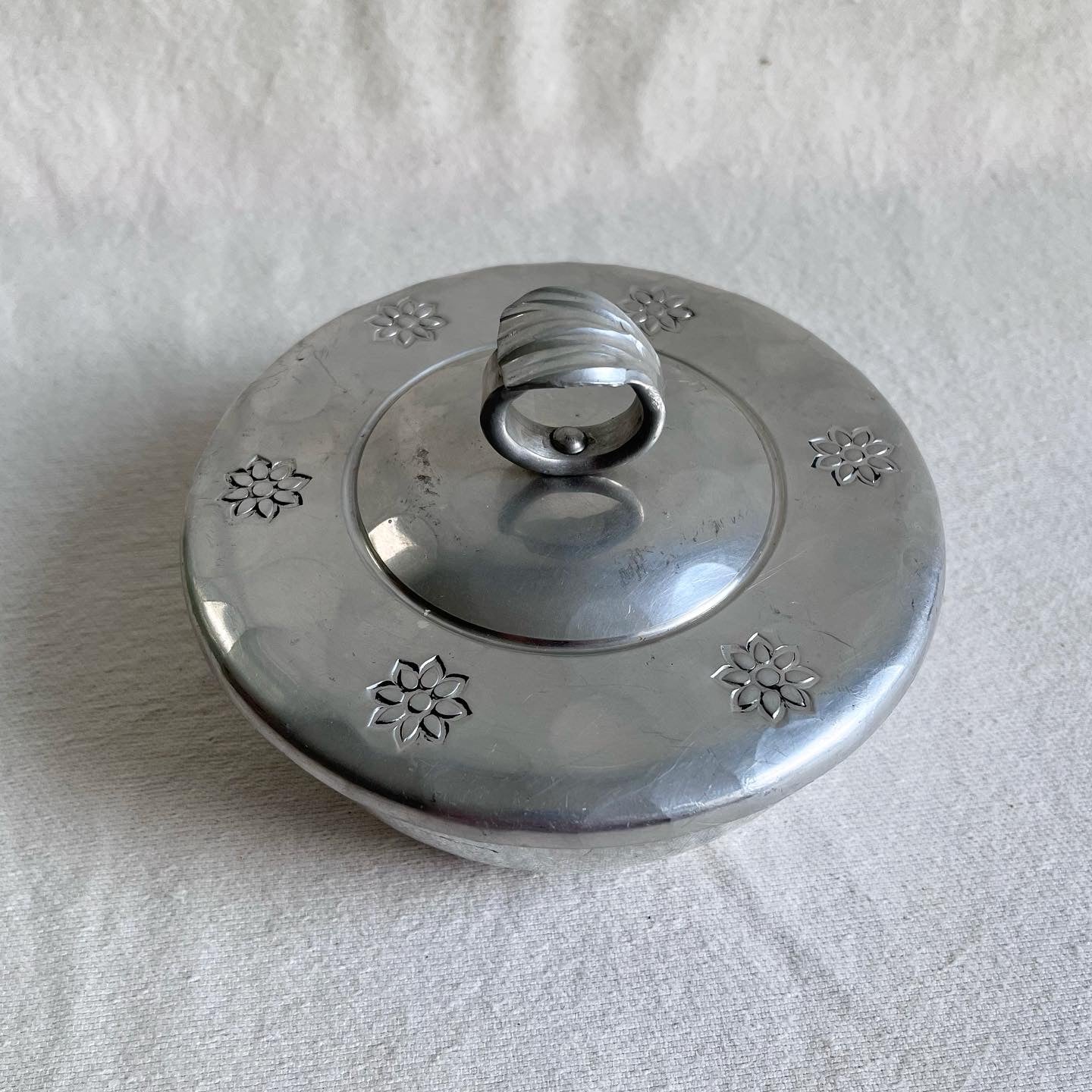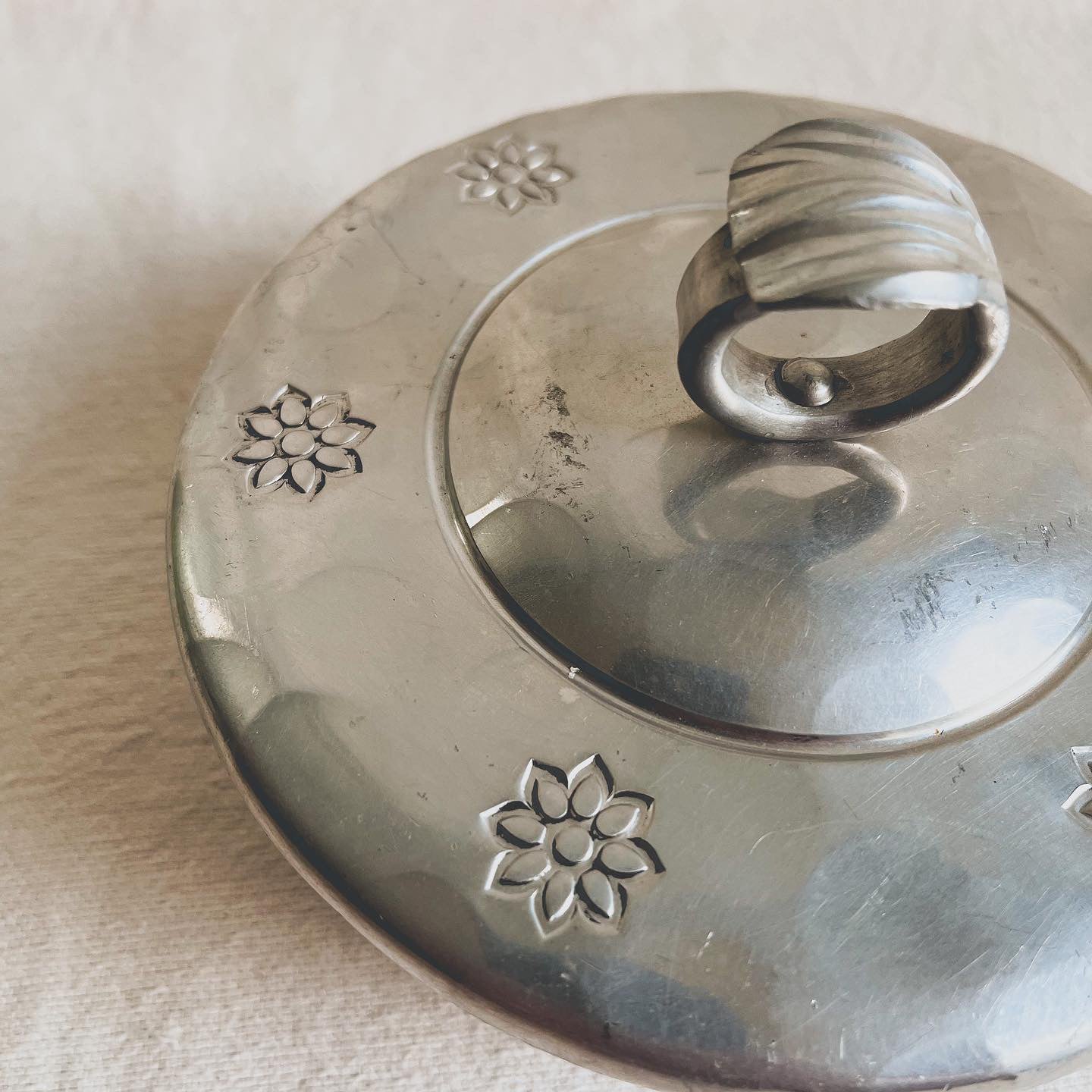 This is a wrought aluminum covered bowl from B. W. Buenilum. It has a textural round hammered pattern all over + the lid has hand wrought flowers + a cool swirly handle. 6"D x 4”T, including handle. Well loved + a very cool piece.