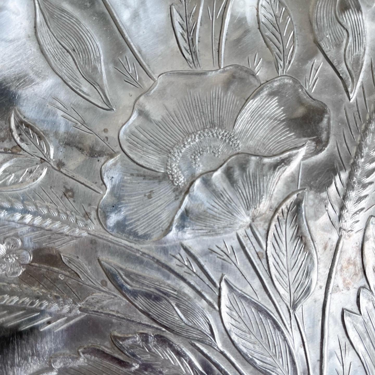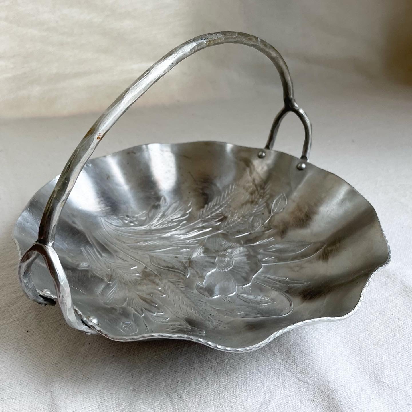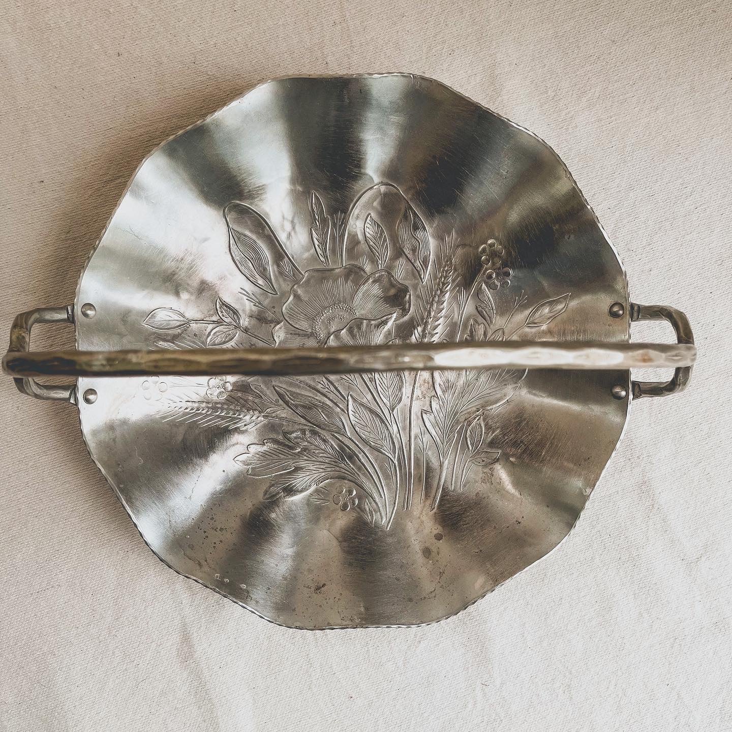 Everlast Forged Aluminum floral tray w handprint handle. Looks even more exquisite in person. 60+ yrs old. 6”H x 9.25”D. Bottom dish is 1.5”T.