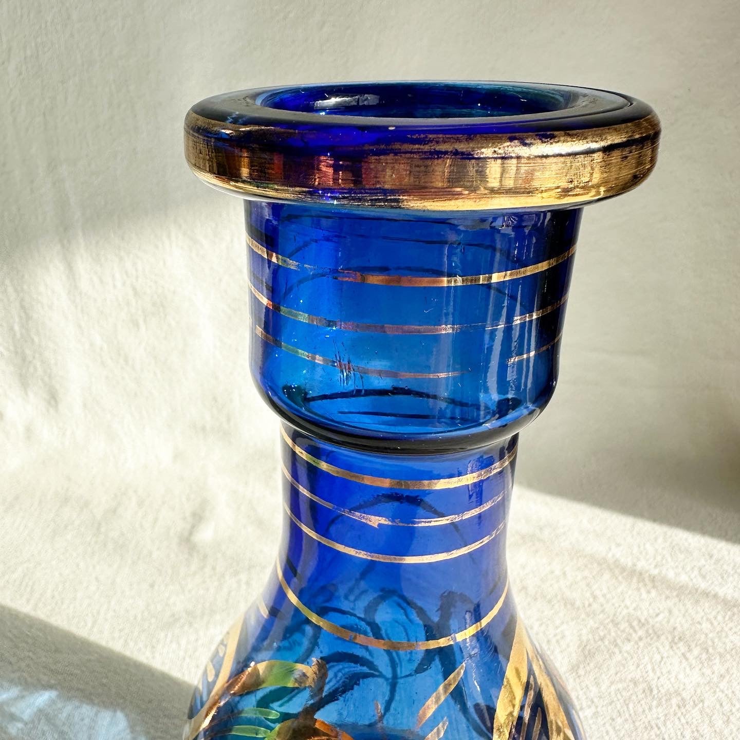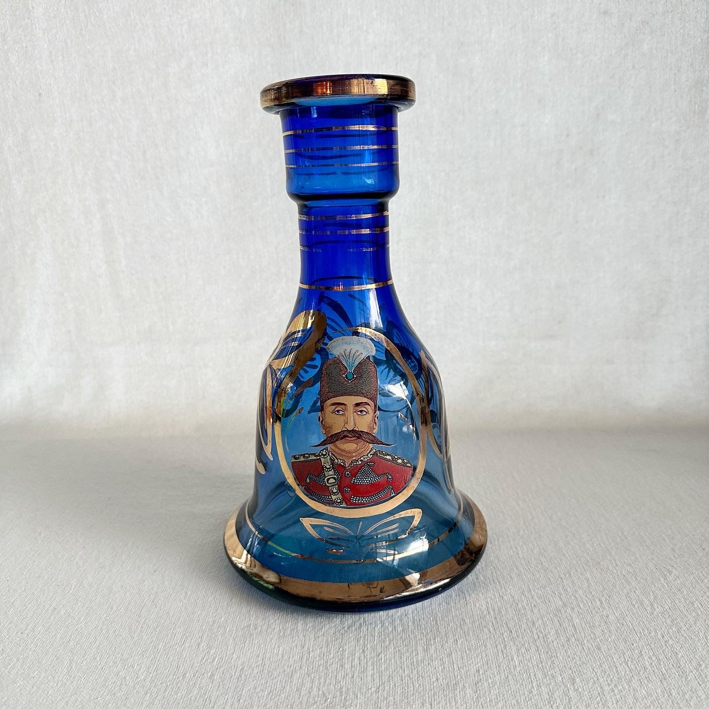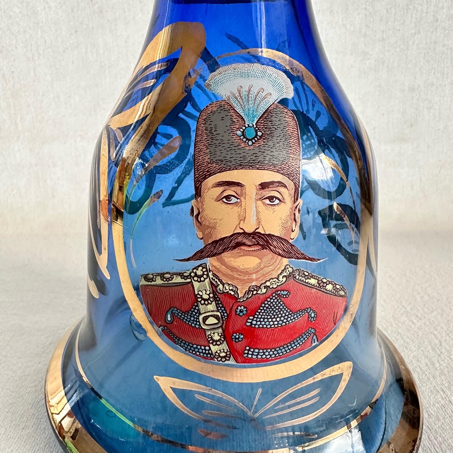 19th c. Antique Qājār cobalt blue glass decanter, vase, or a "base," w gilt decoration + enamel detailing surrounds a print transfer cartouche of Nāṣer al-Dīn Shāh, Qājār shah of Iran from 1848-1896. Hand painted, one tiny crack/chip on front.