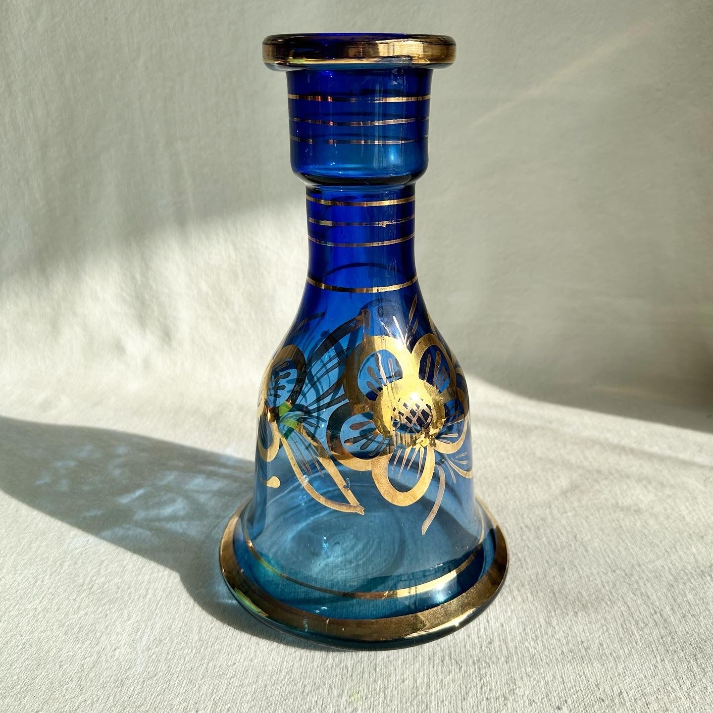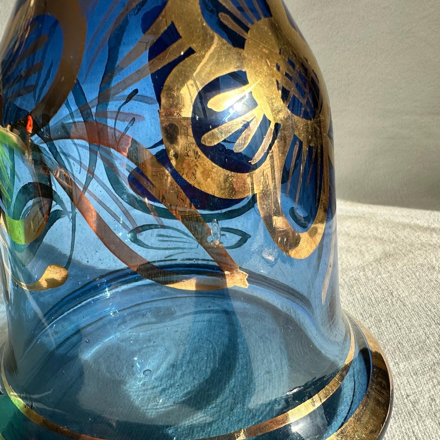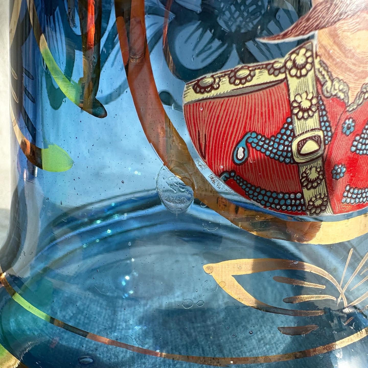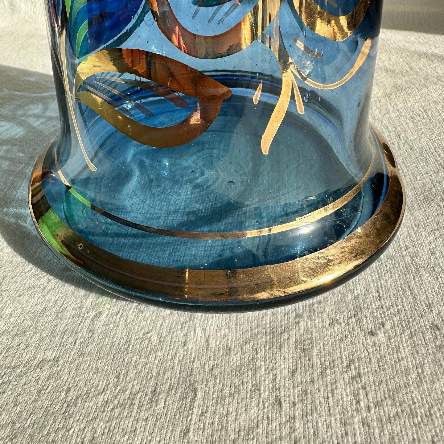 19th c. Antique Qājār cobalt blue glass decanter, vase, or a "base," w gilt decoration + enamel detailing surrounds a print transfer cartouche of Nāṣer al-Dīn Shāh, Qājār shah of Iran from 1848-1896. Hand painted, one tiny crack/chip on front.