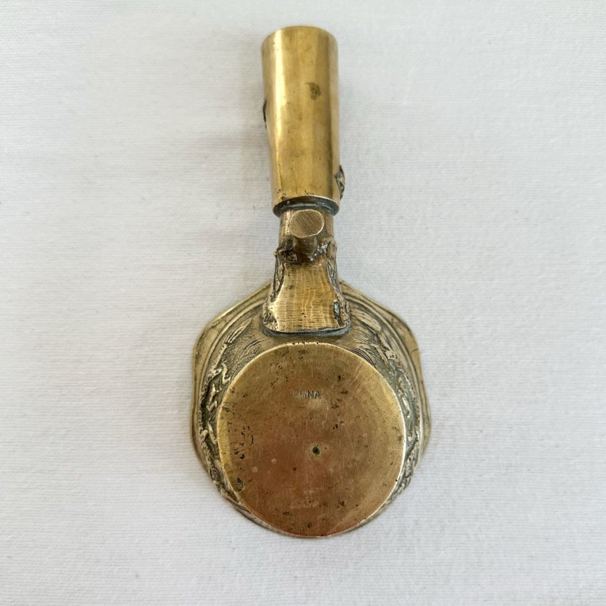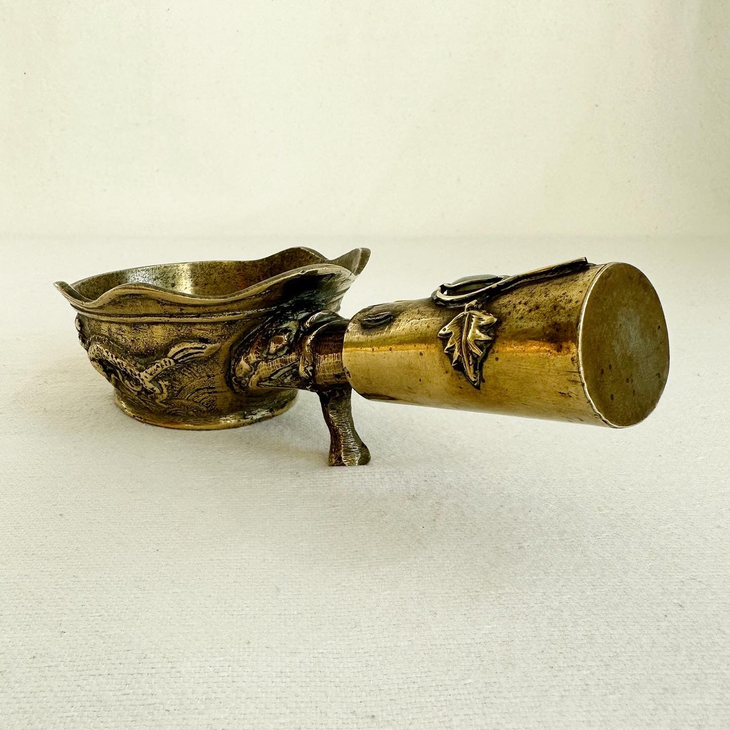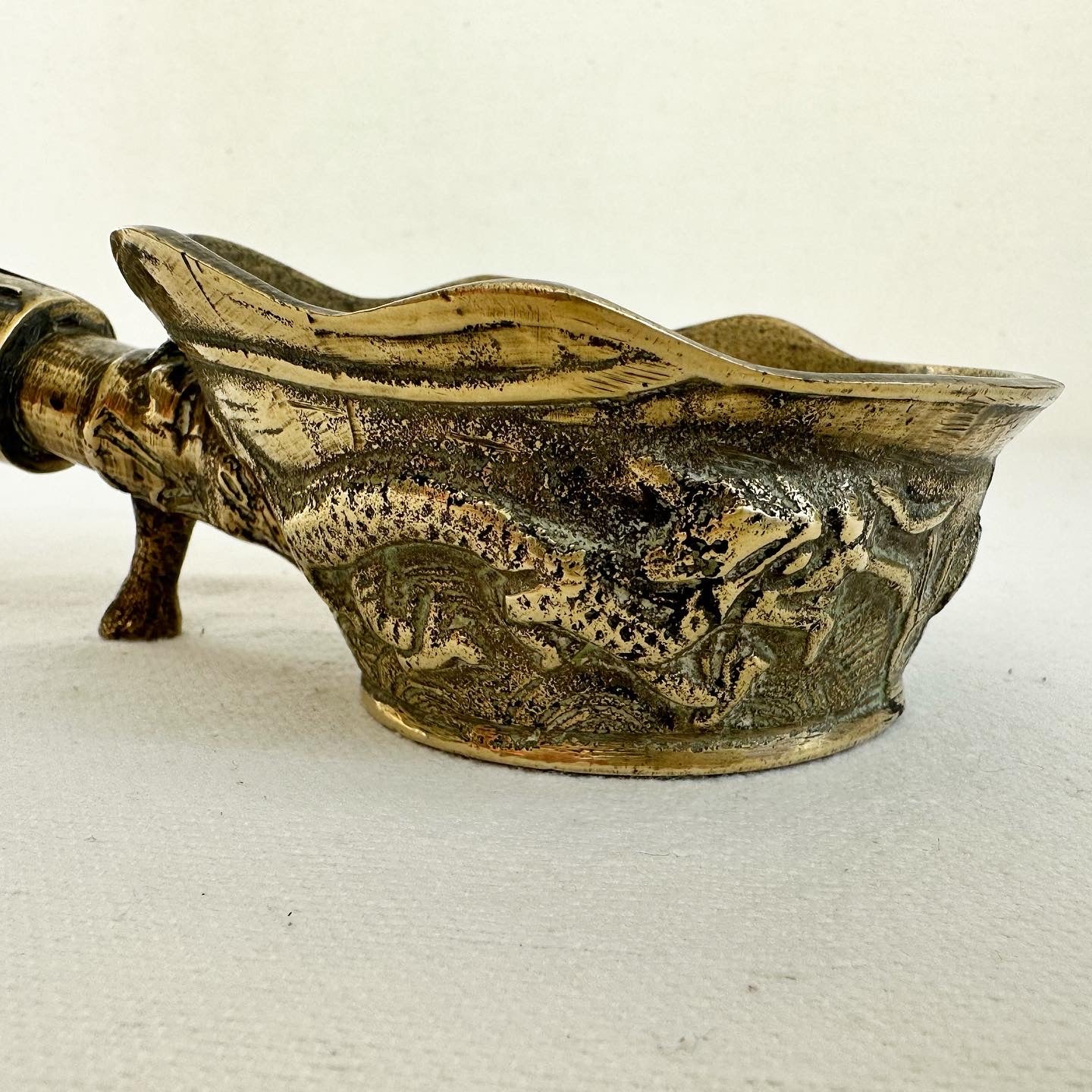Rare antique, circa 1900, ornate brass pot formerly used in China for ironing silks. The pot would be filled with hot sand + the base would smoothly run over the silk. It was called a dragon pot. 9.3 oz.