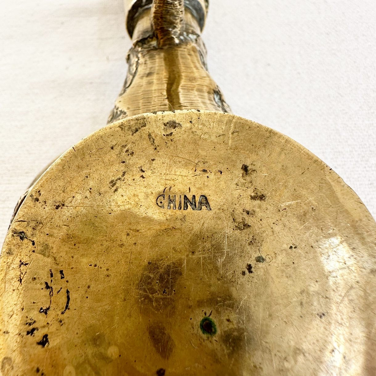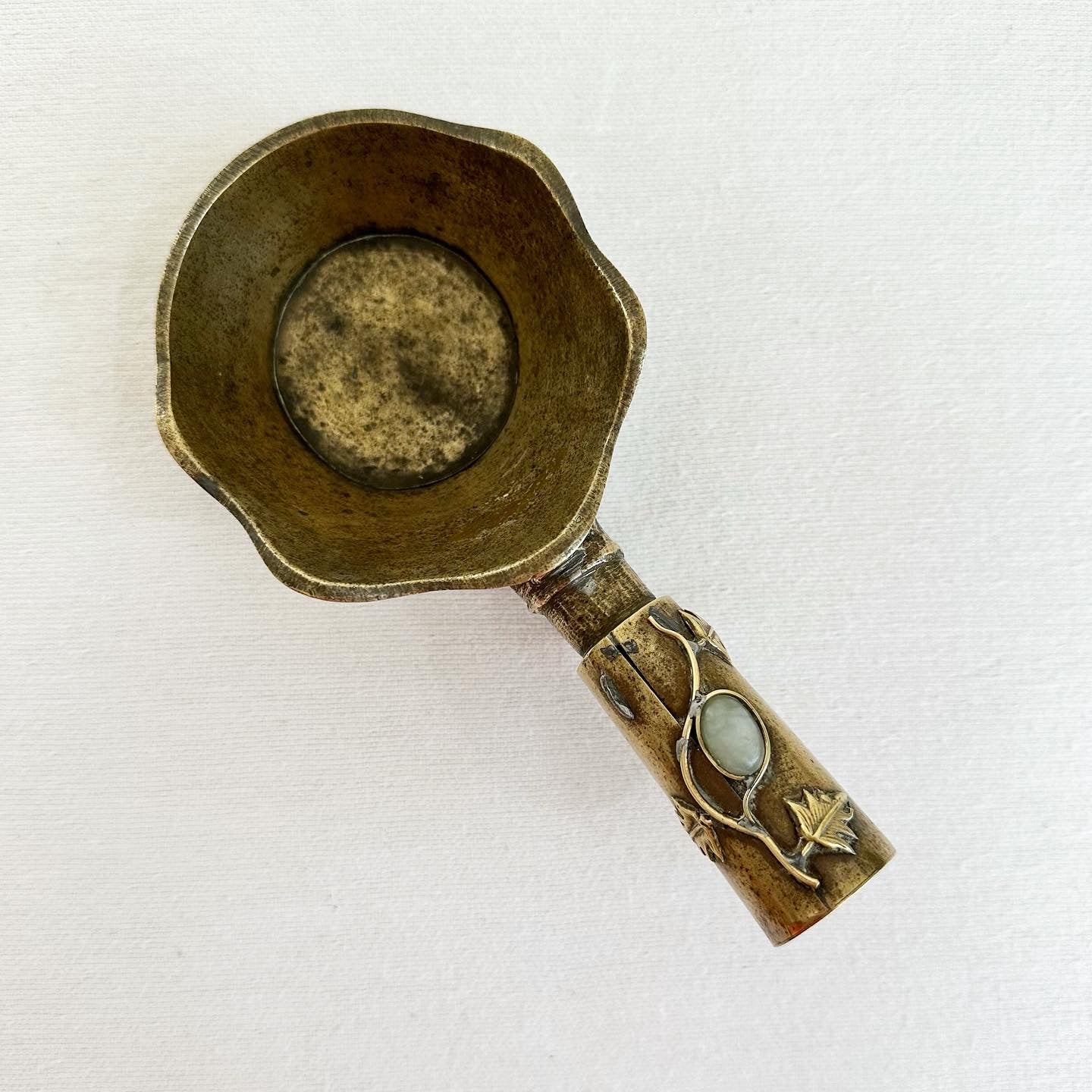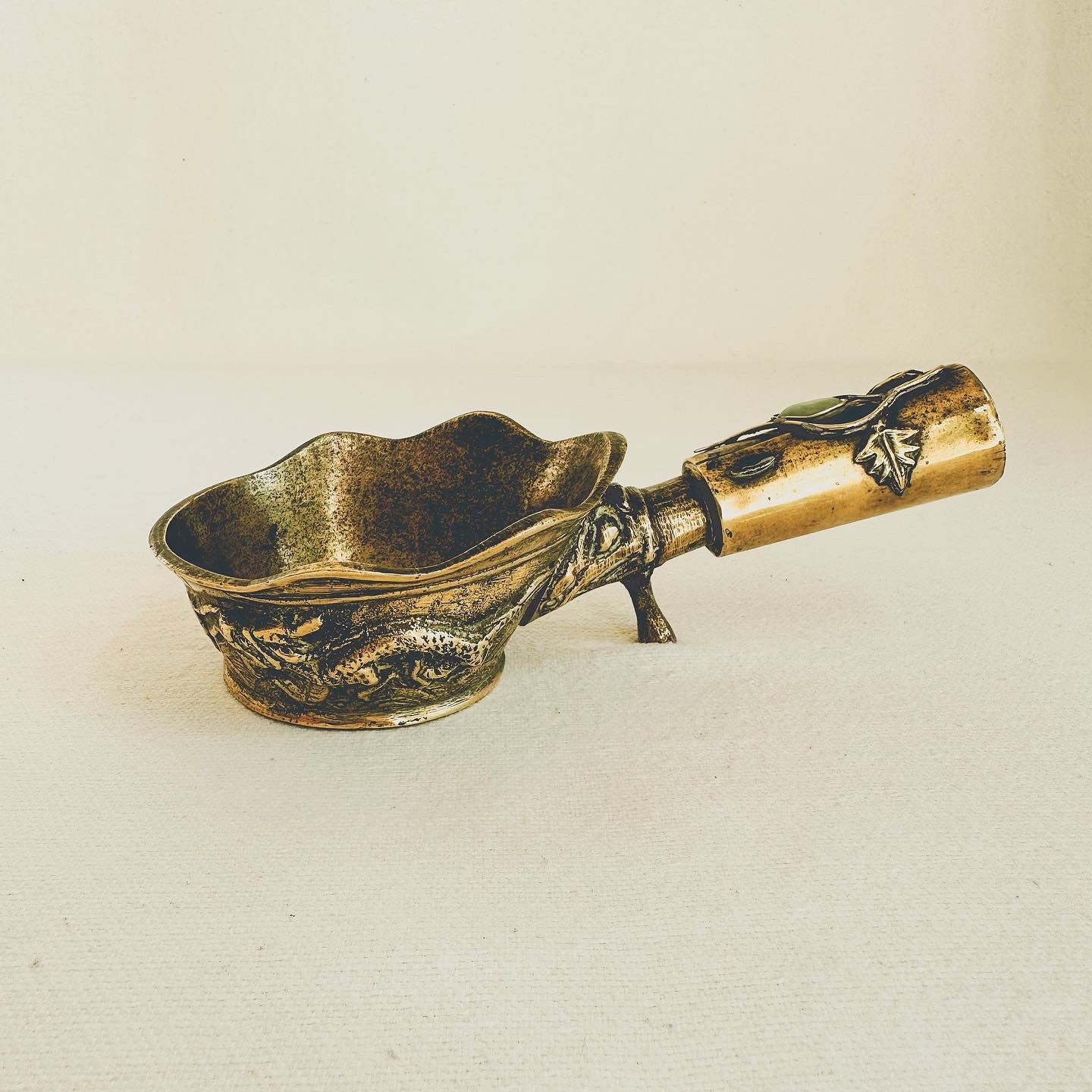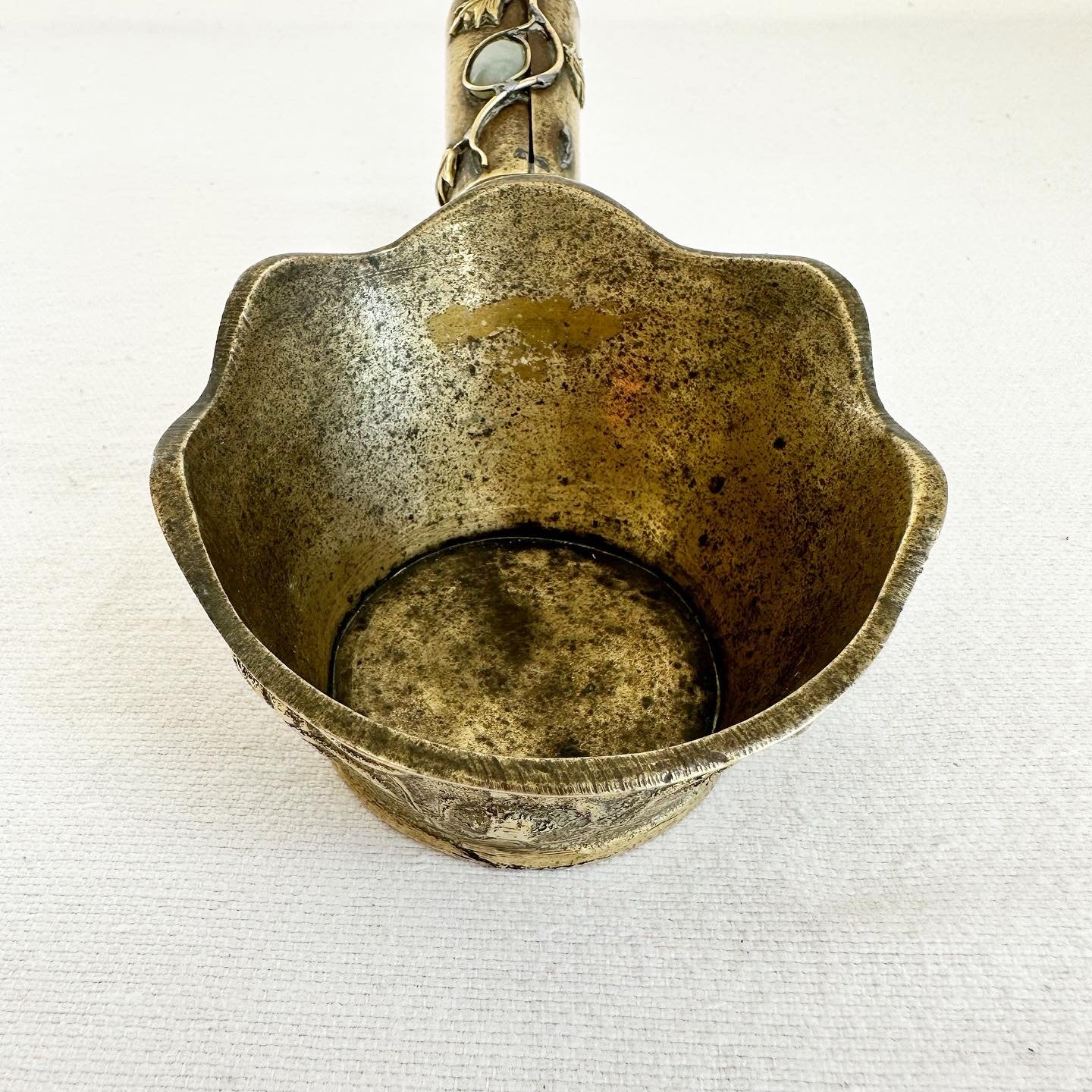 Rare antique, circa 1900, ornate brass pot formerly used in China for ironing silks. The pot would be filled with hot sand + the base would smoothly run over the silk. It was called a dragon pot. 9.3 oz.