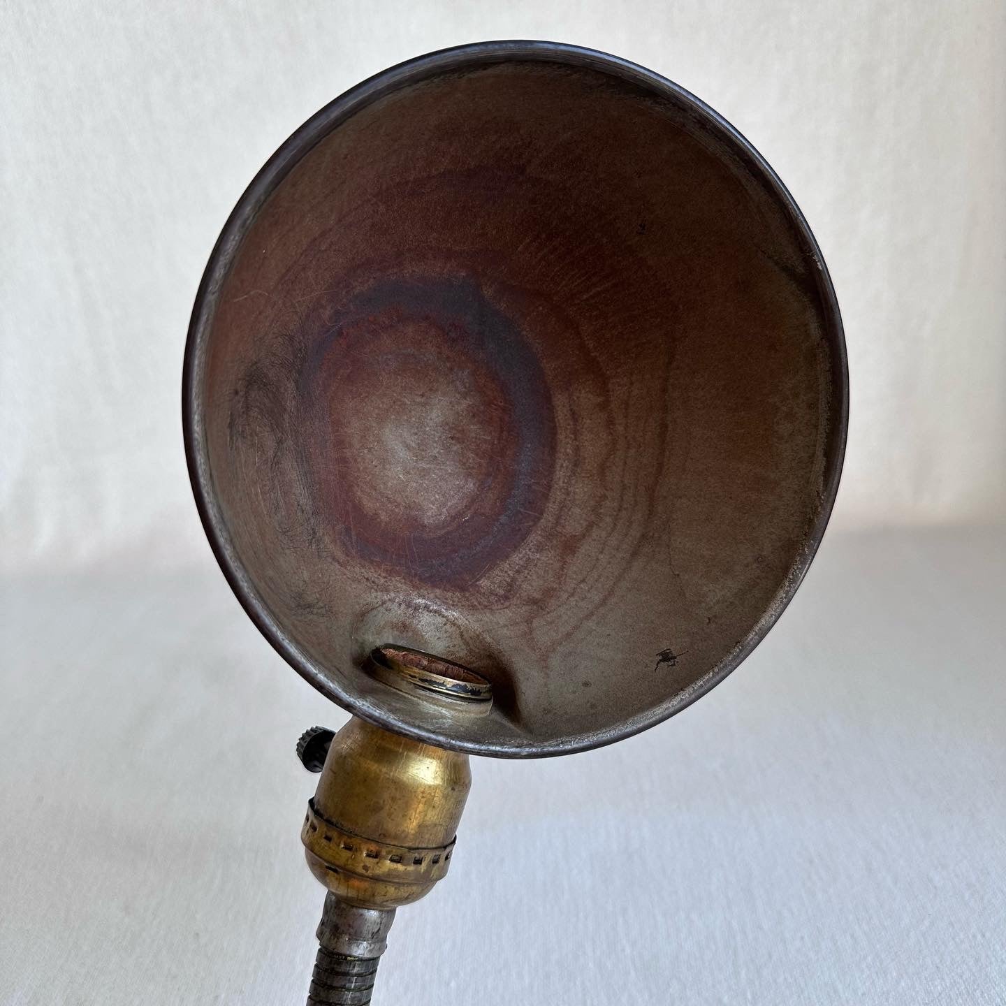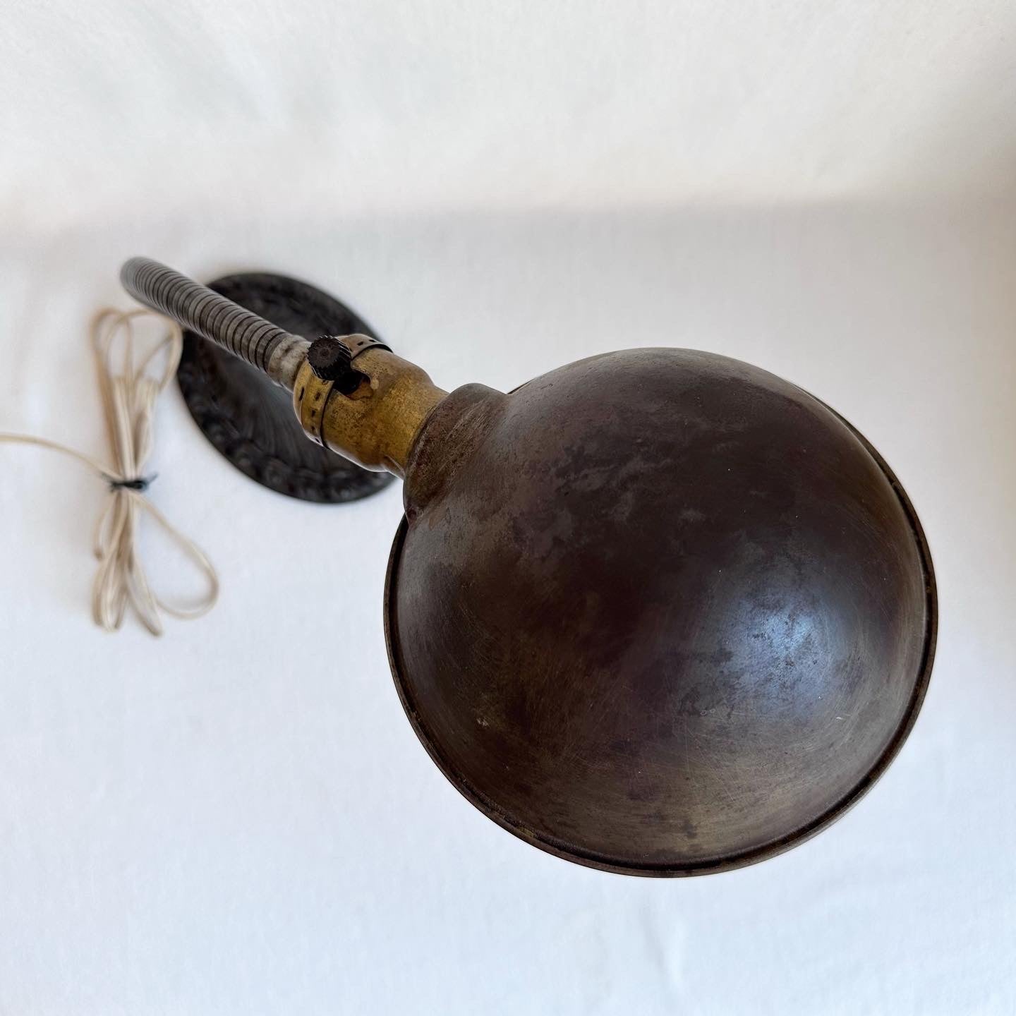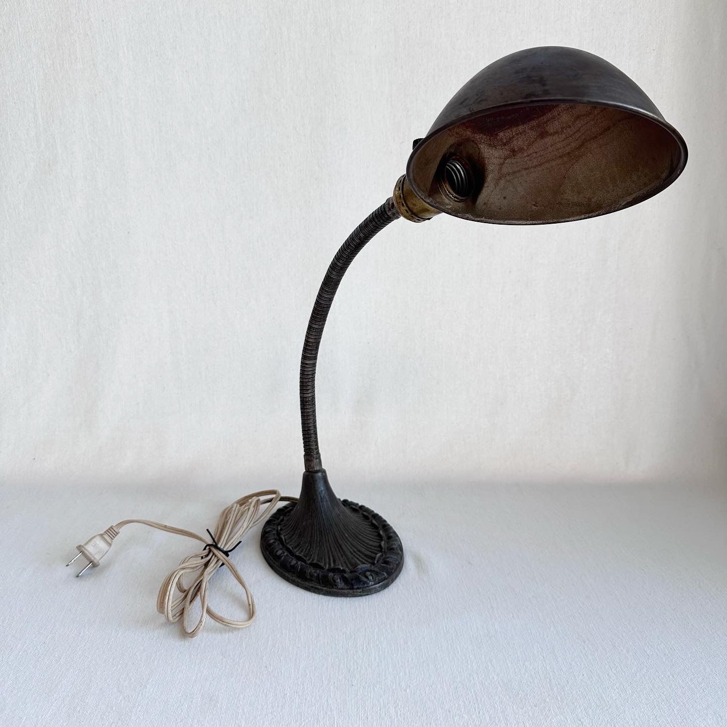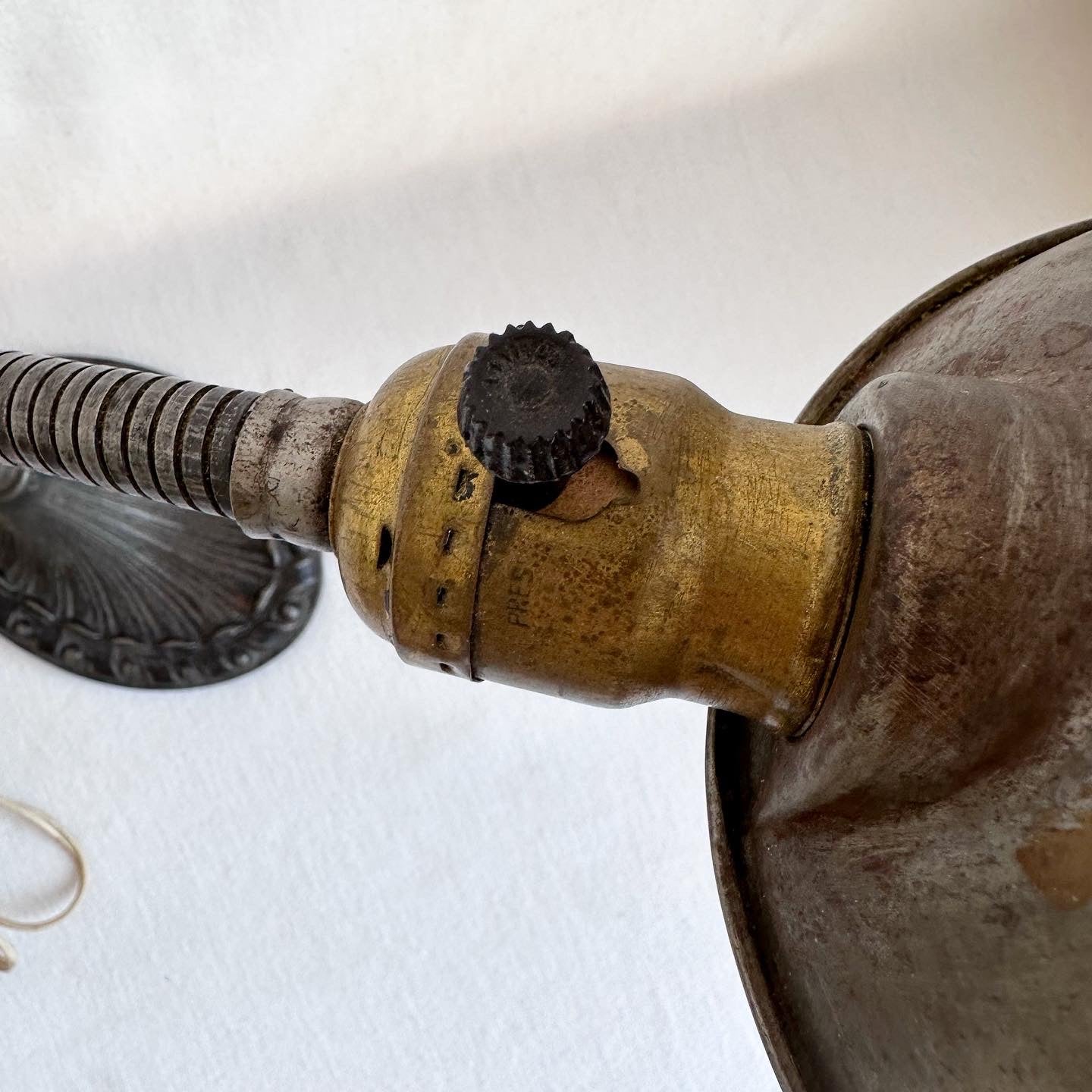 Antique Art Deco gooseneck desk lamp w steel shade + cast iron base, decorated w a scallop shell, intertwining rope + ball design.