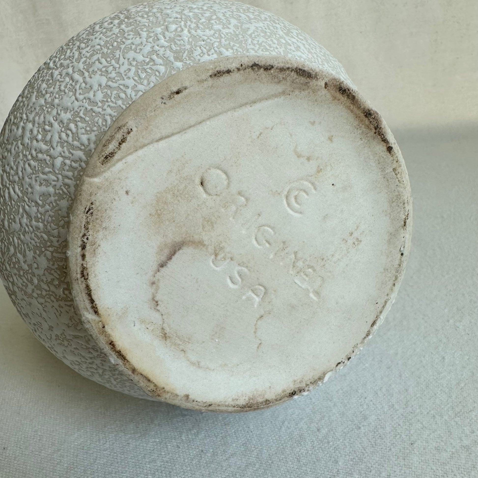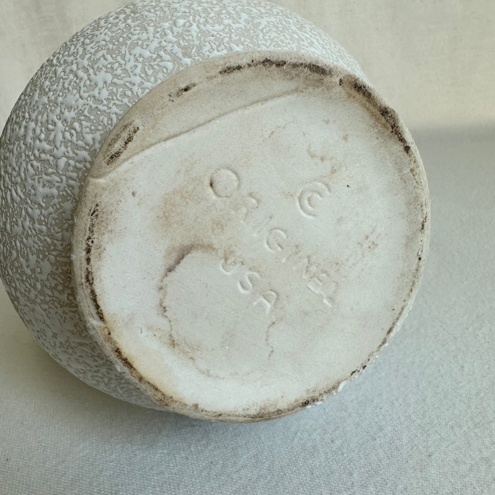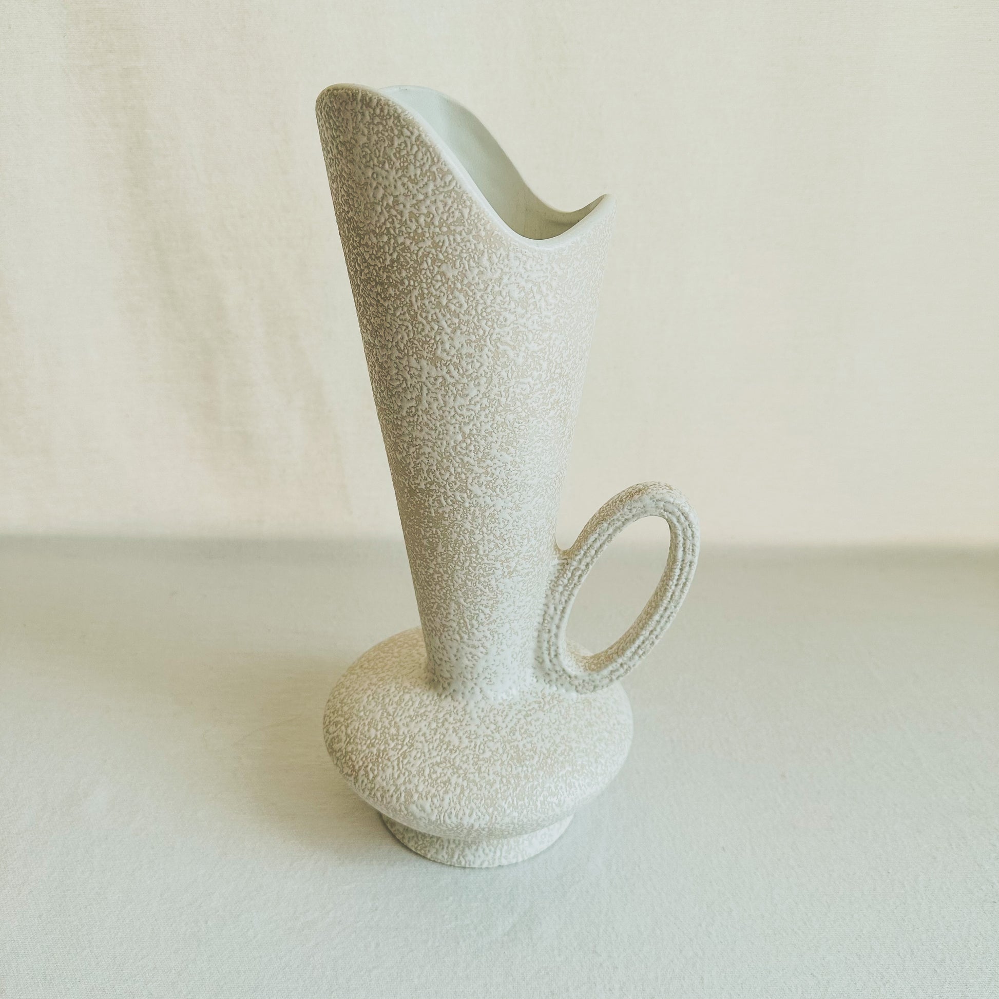 California Originals MCM white pebbled/speckled glaze pitcher. The atomic form of it, right? 14”x 6.25”