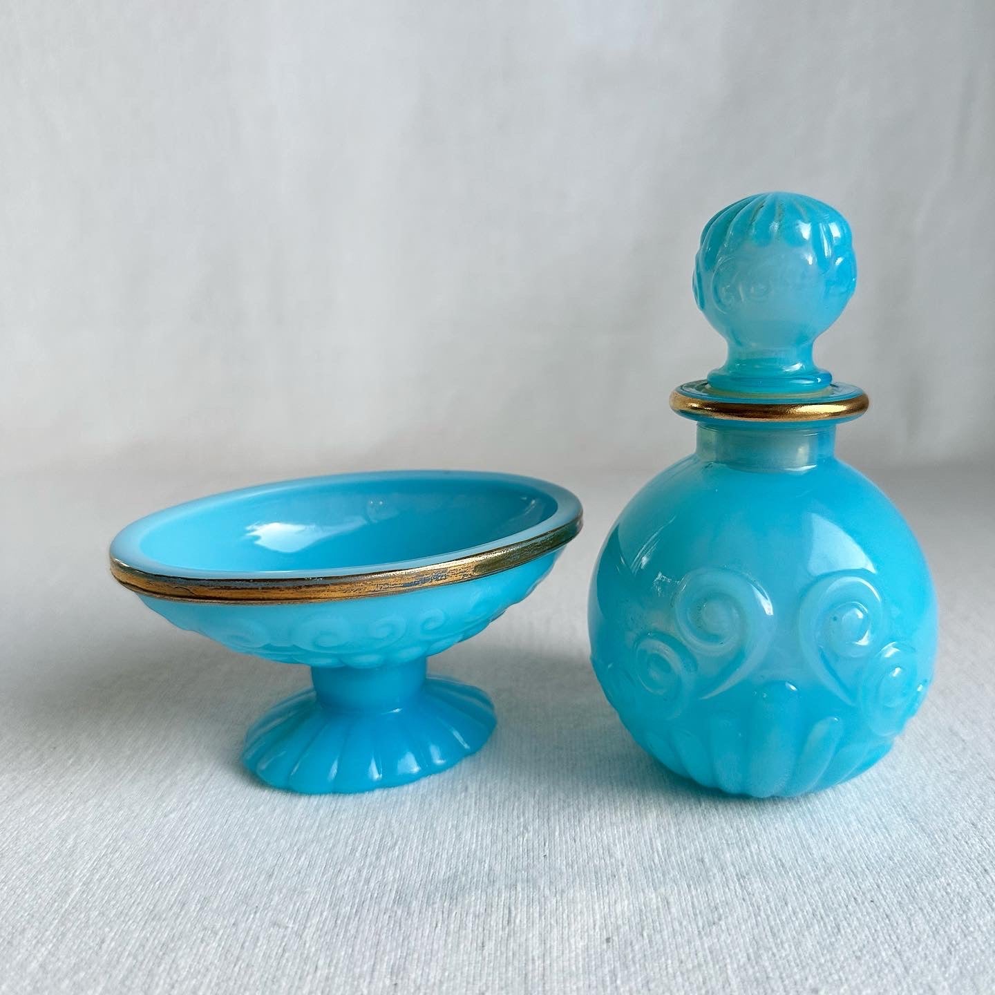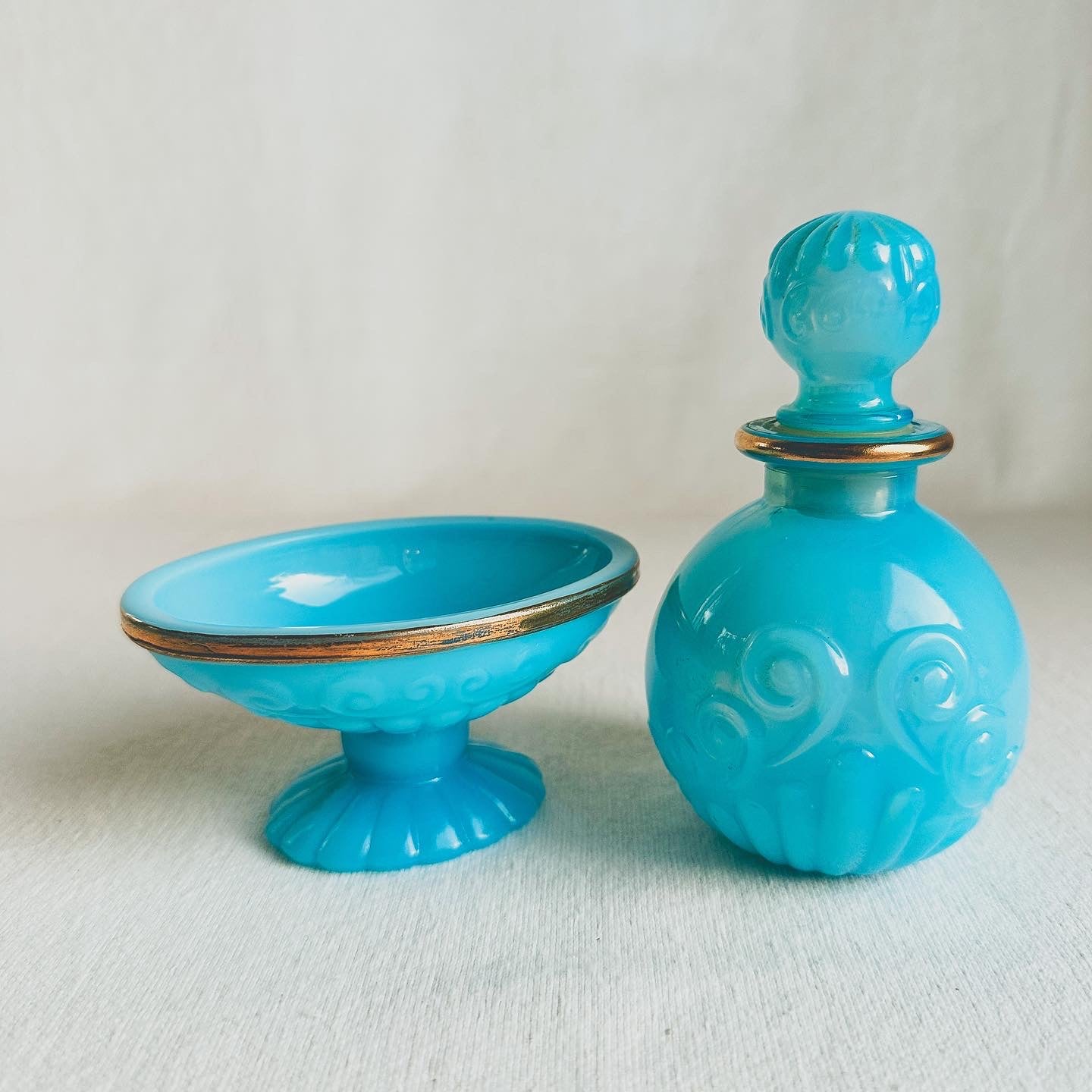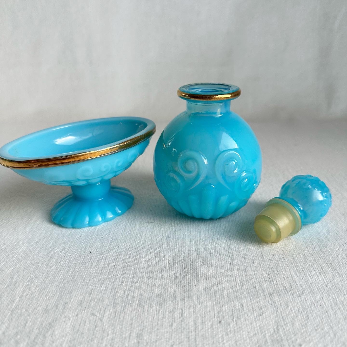 Avon Bristol blue opaline perfume bottle + soap dish. Gold accent is in great shape.