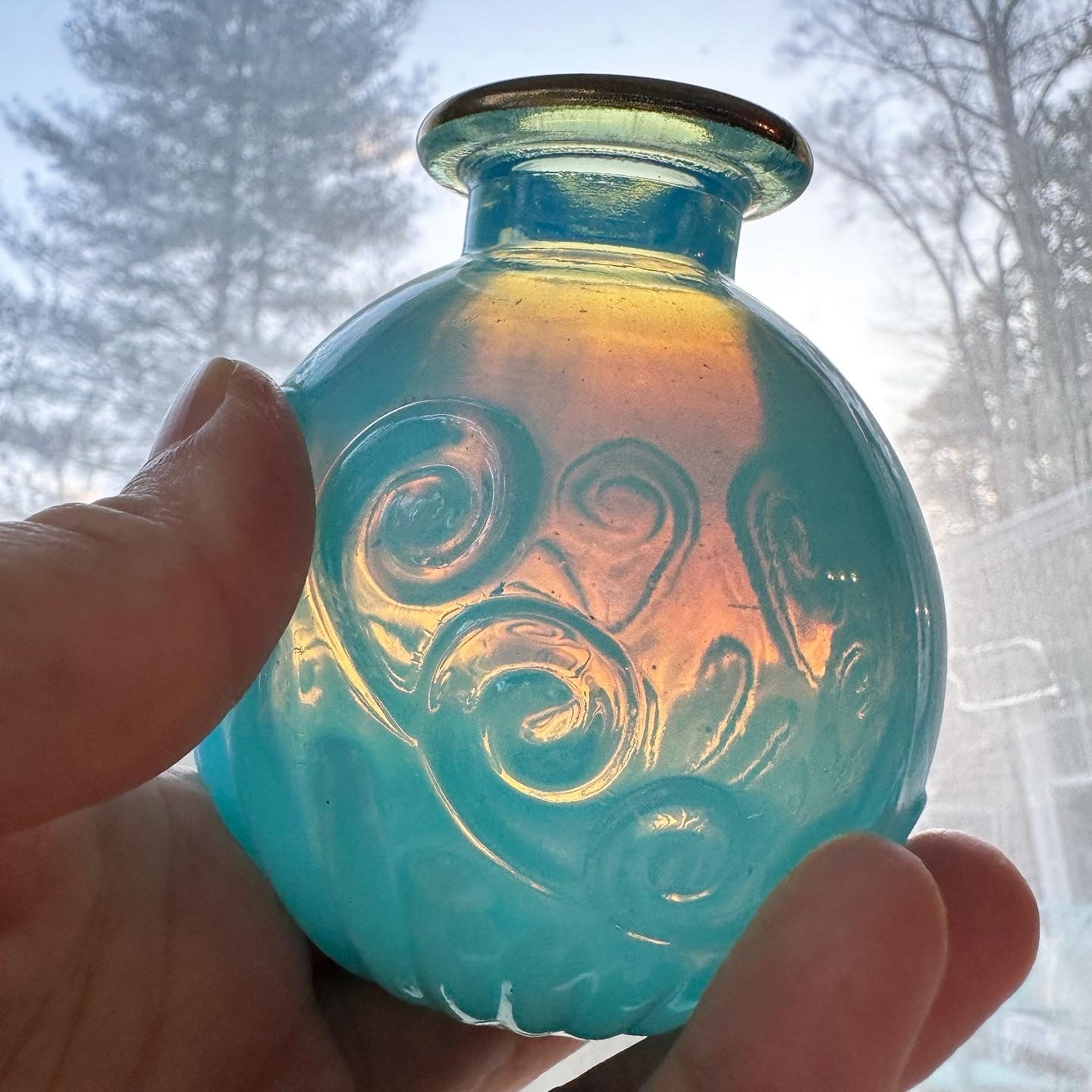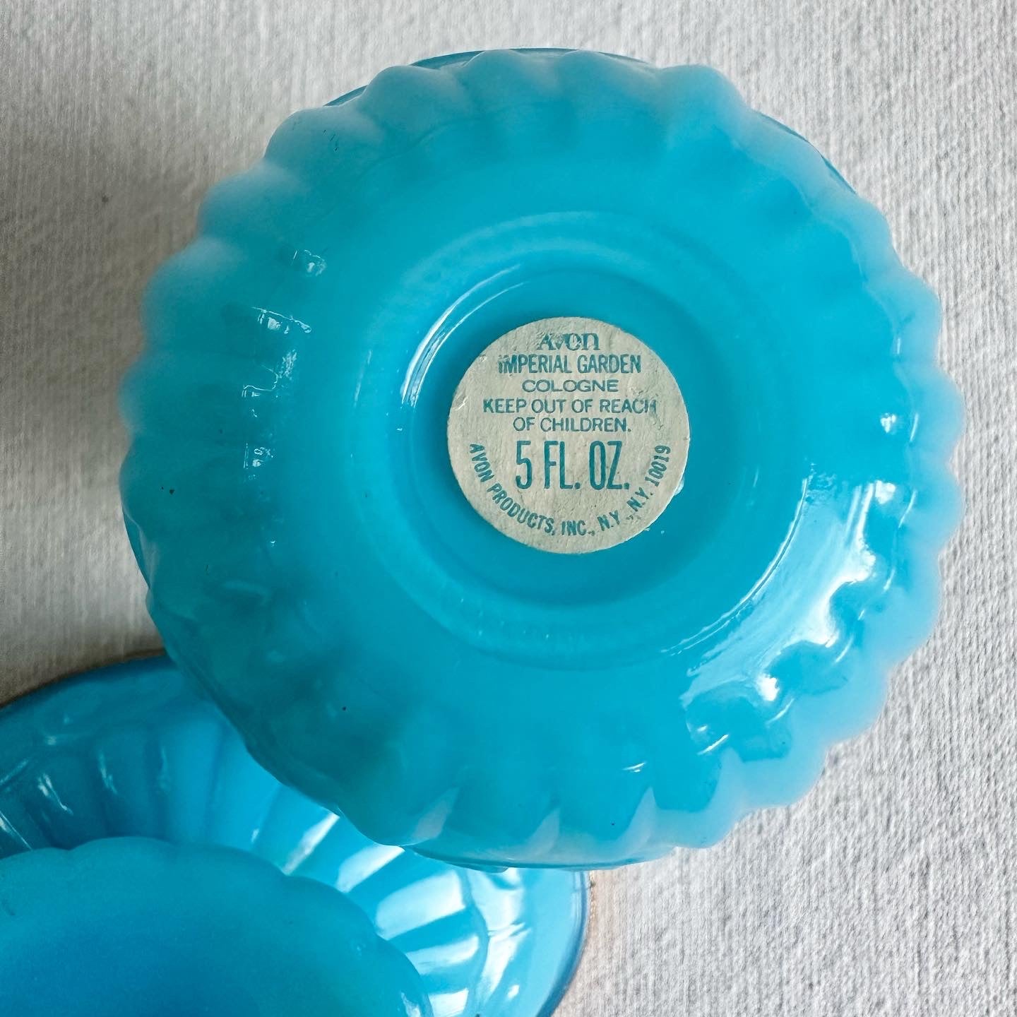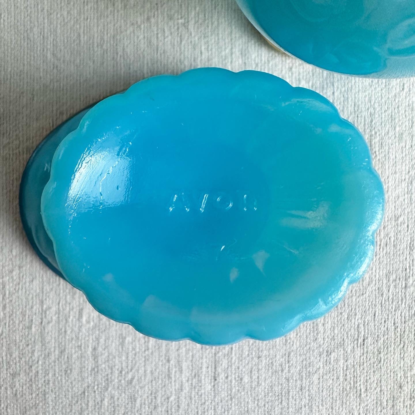 Avon Bristol blue opaline perfume bottle + soap dish. Gold accent is in great shape.