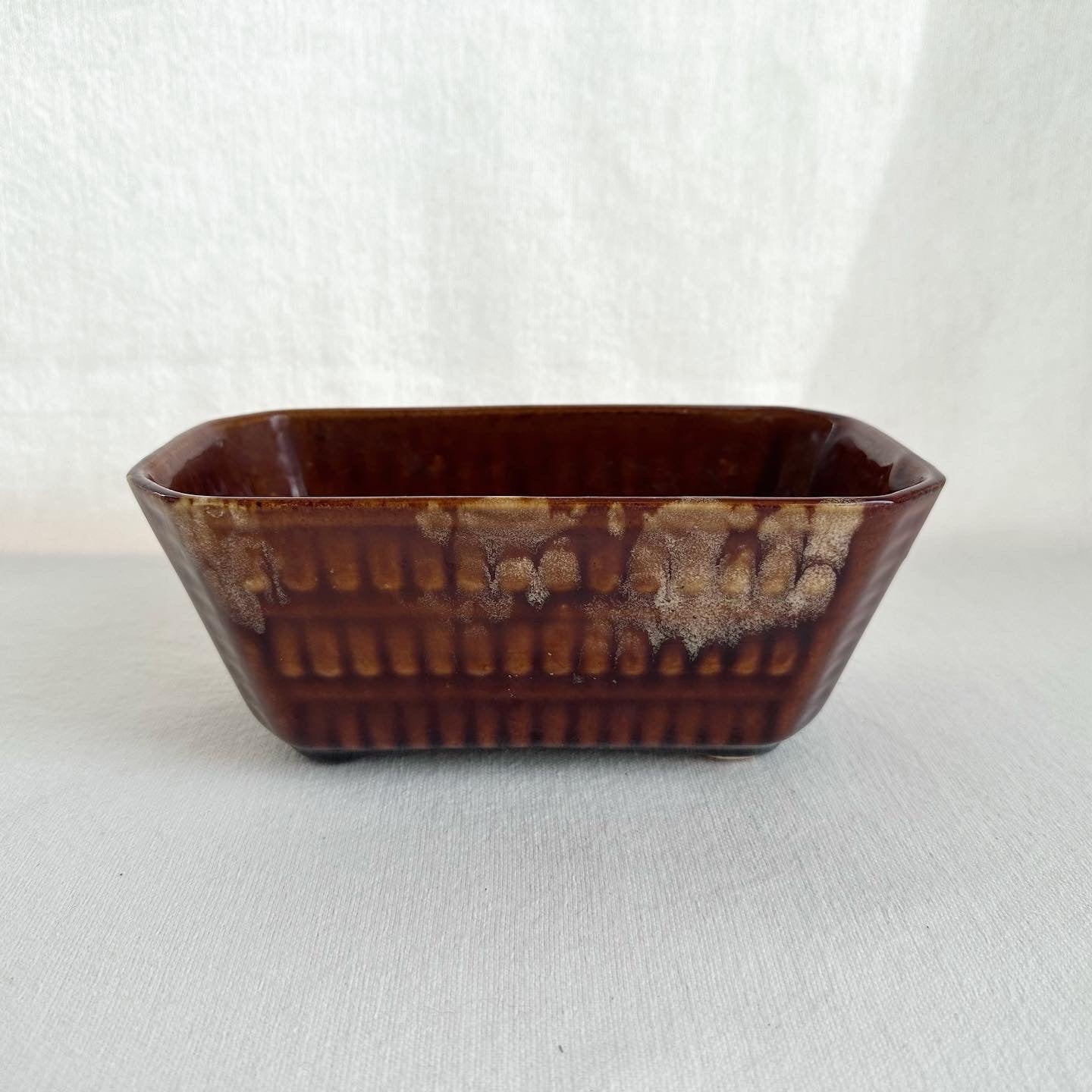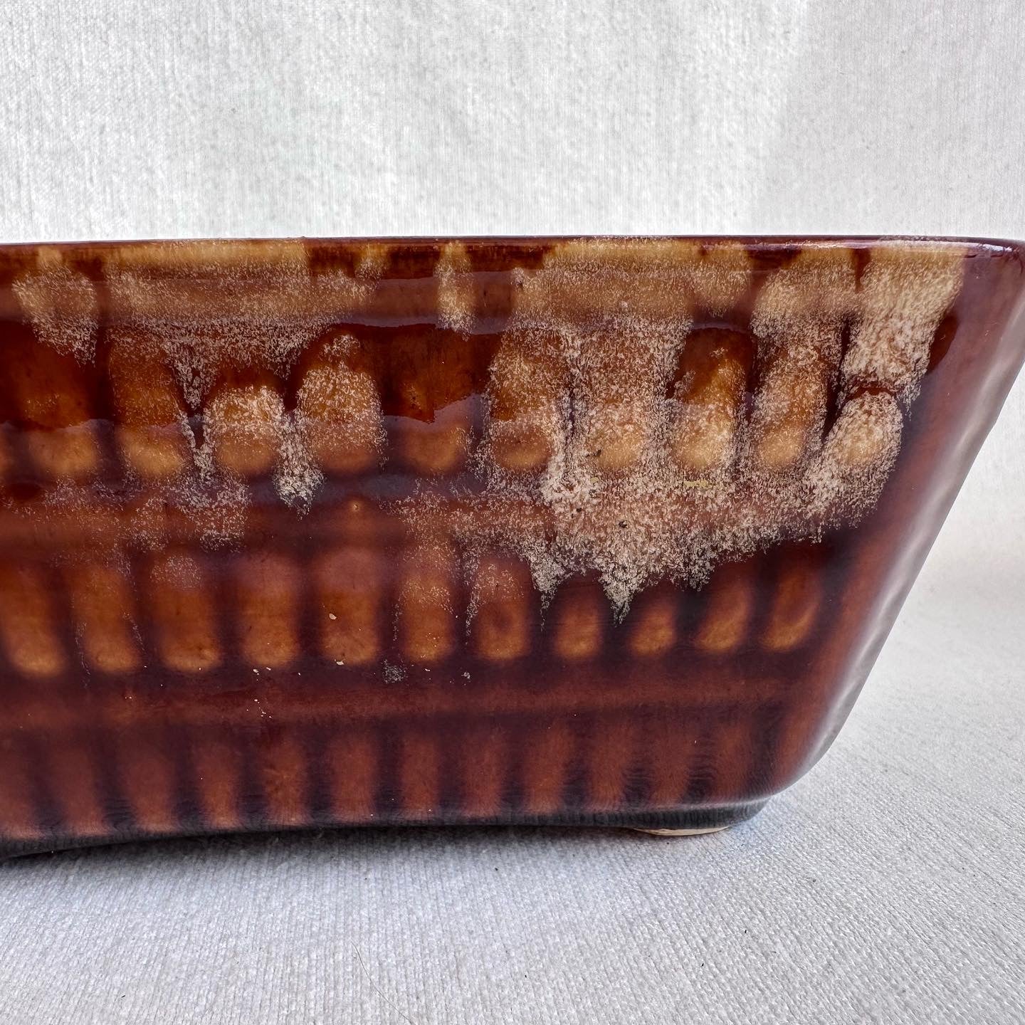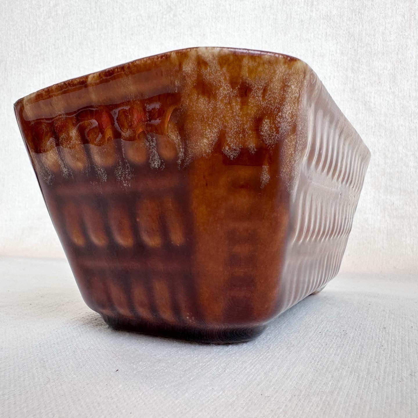 Mid century pottery 70s gem. The glazing pattern is unique, just like its scale-like pattern.