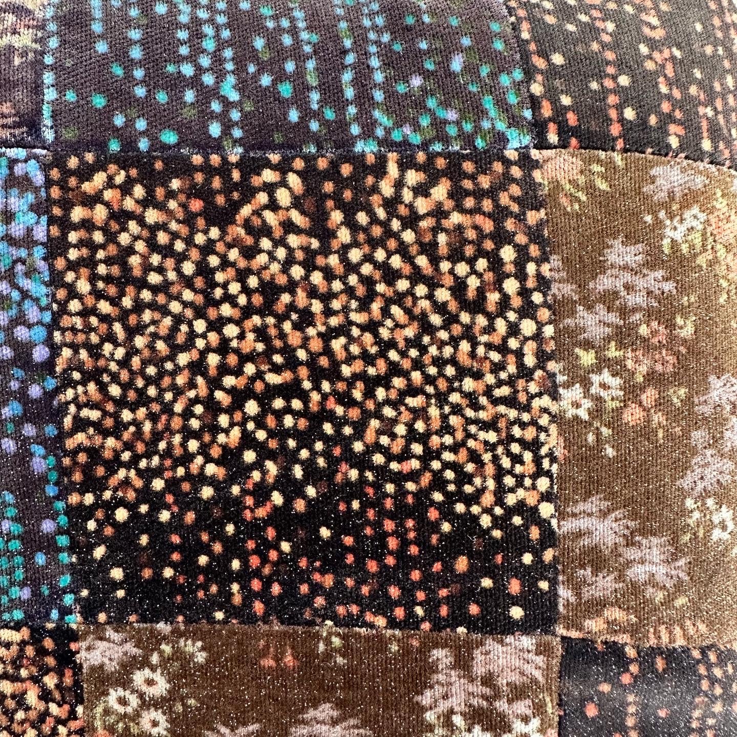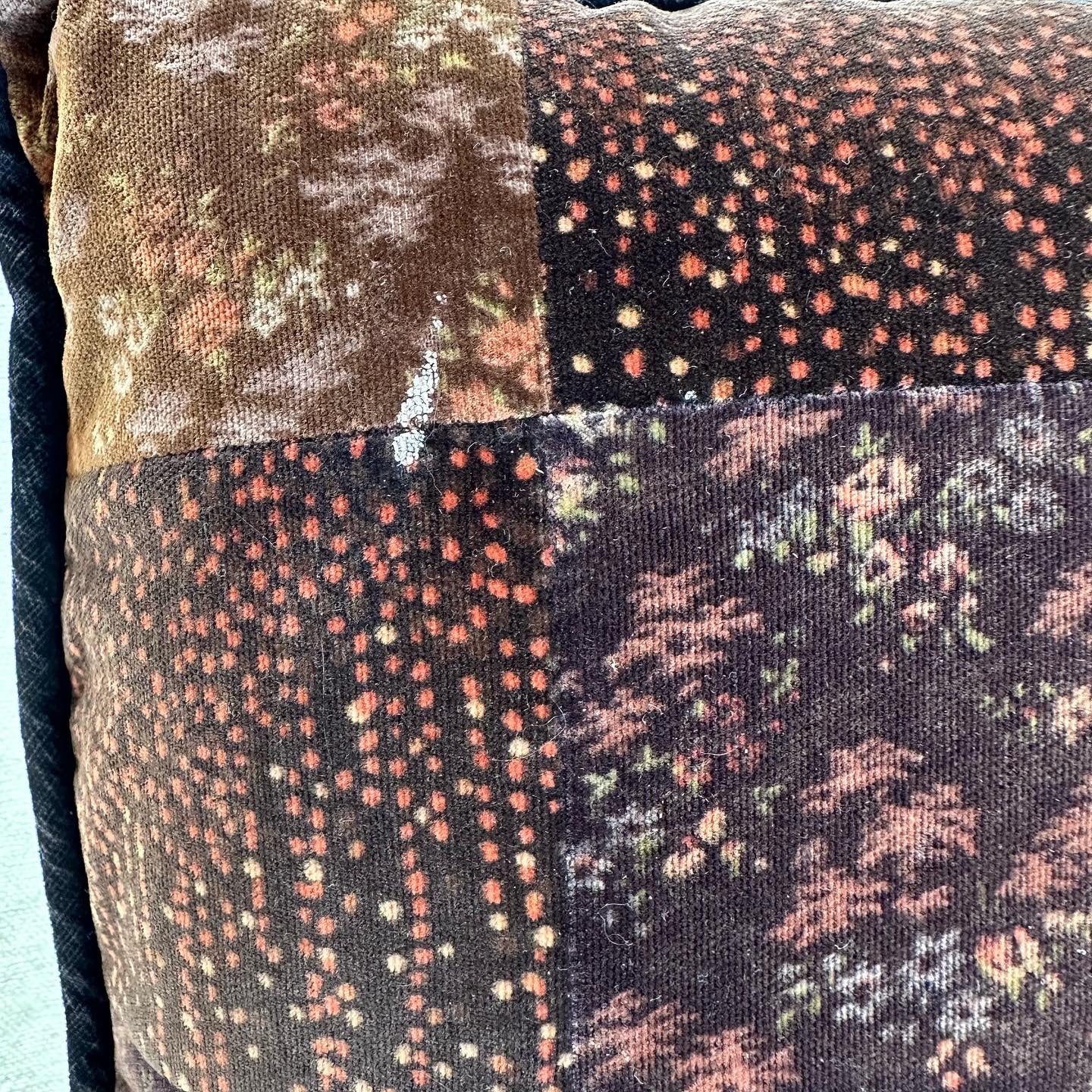 Funky fun brown patchwork pillow. Velvet front + corduroy back make it super soft. There’s white paint splatter, that I’ve tried to shave off, but there’s still some left, w the larger white paint stain, as pictured. Hole + small stains on back. 16x16.