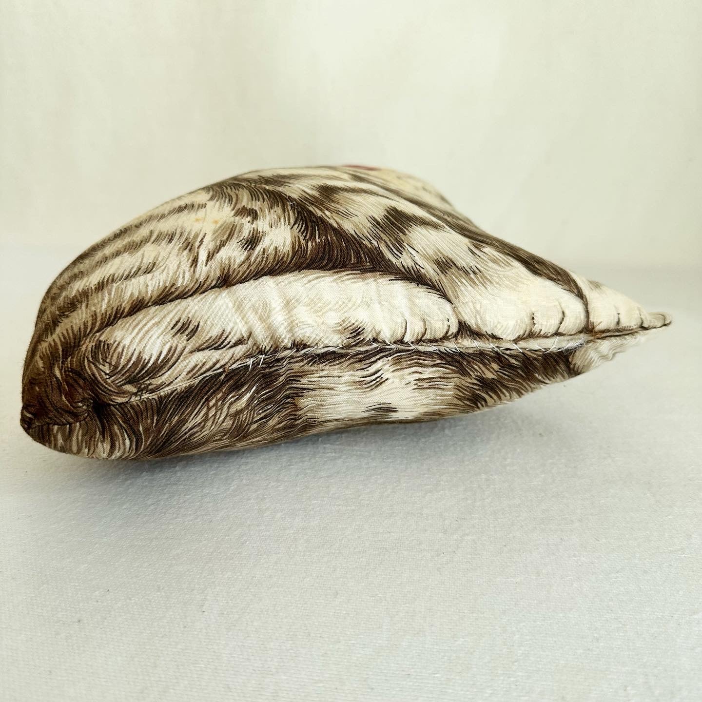 Handmade tabby cat pillow w a pinkish reddish ribbon. Has orange spots all over, possibly from air/water damage.