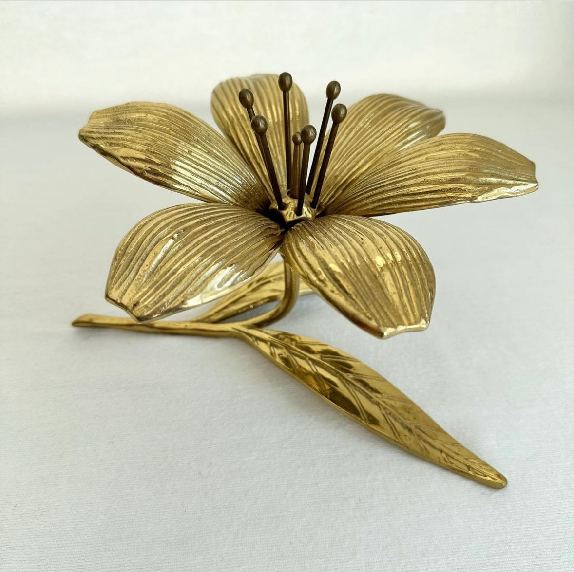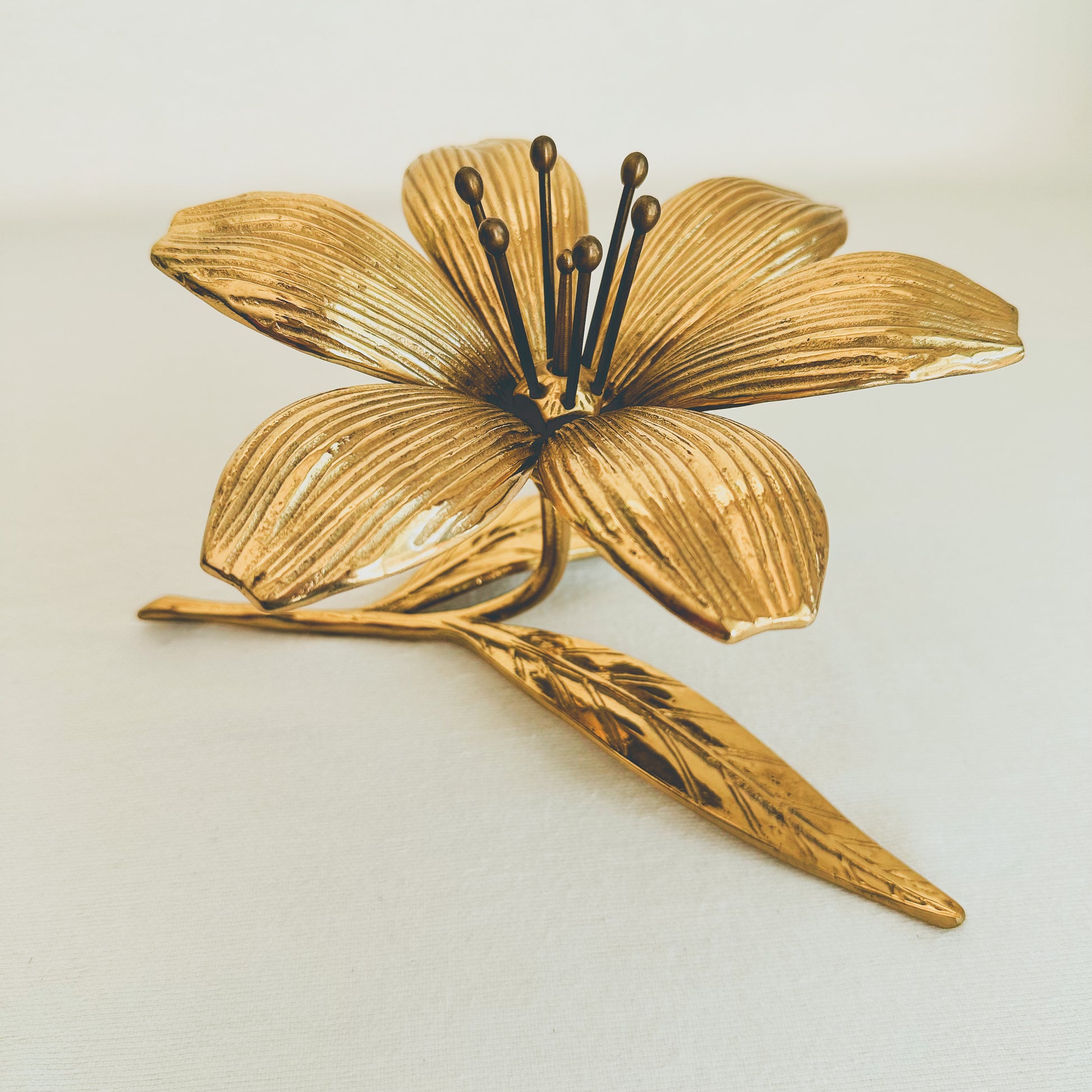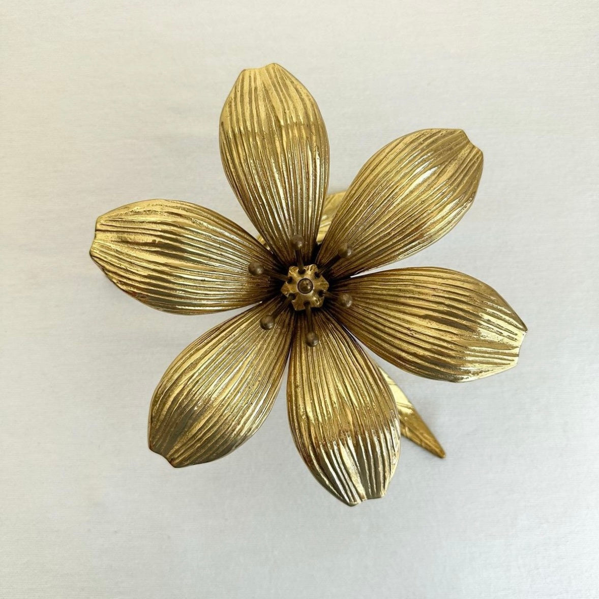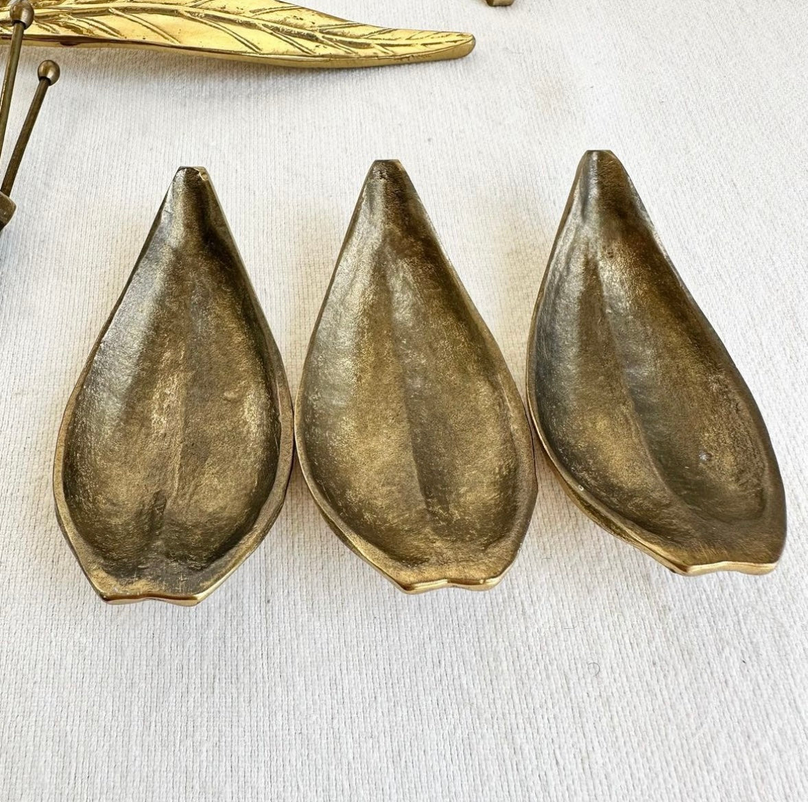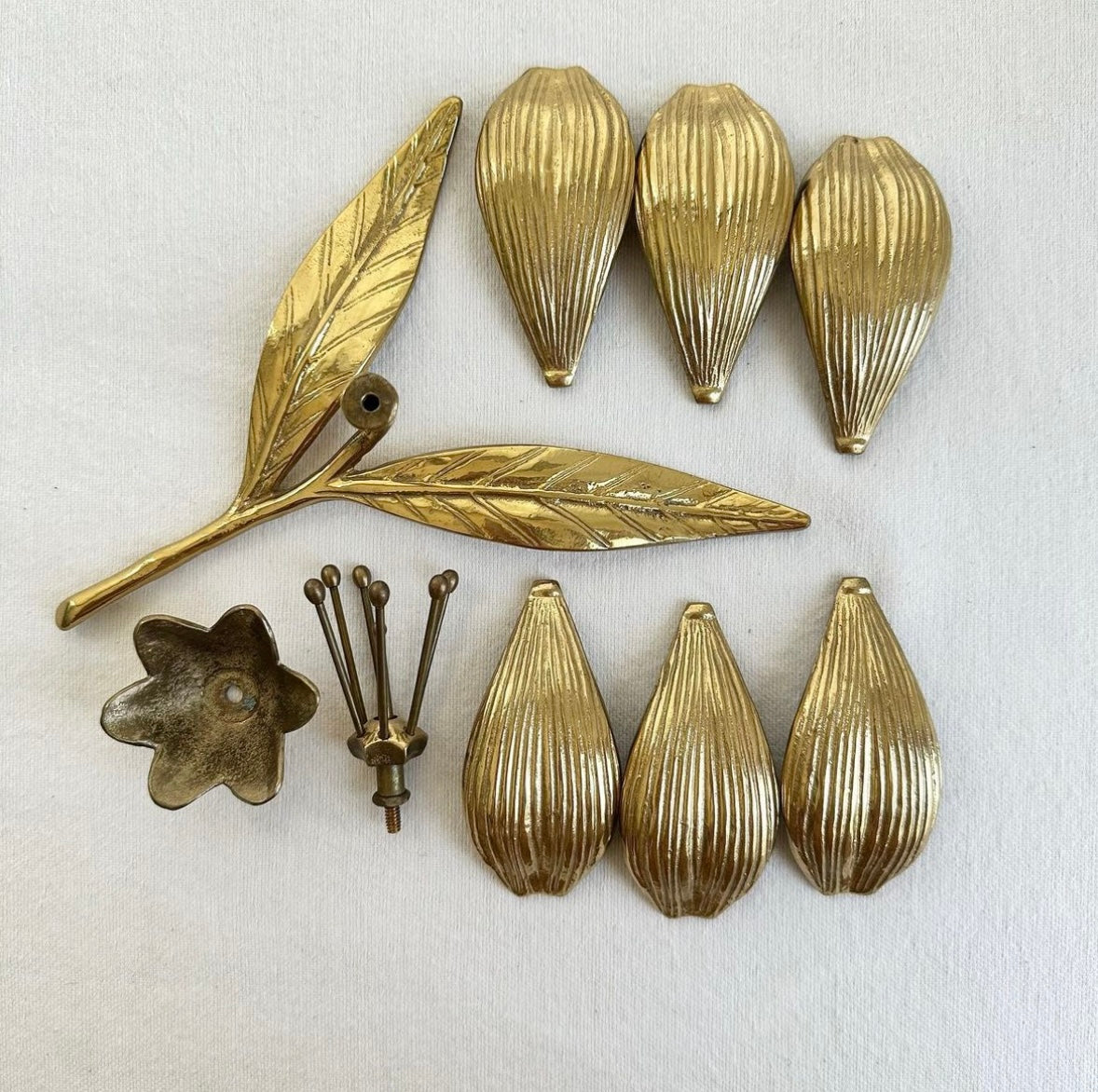 Hollywood Regency style mid century modern sculptural brass "party flower" featuring six removable petal ashtrays. Center acts as a cradle for a lighter if desired + it twists to tighten the petals in place. The six ‘stamins’ in the center are removable + have pin sharp tips that are assumed to be used for poking holes in cigars or clearing pipes. Very unique decorative piece w a hidden function.