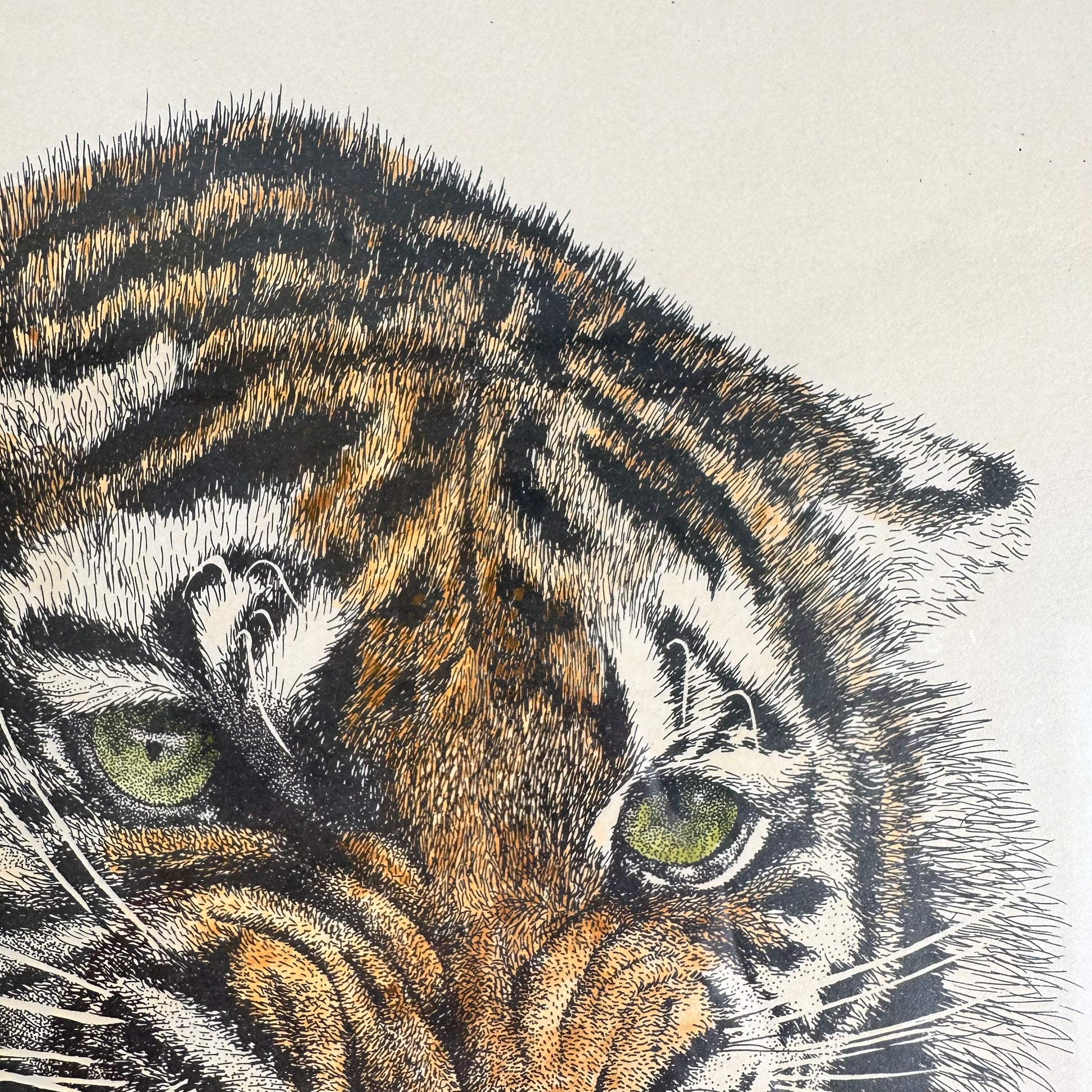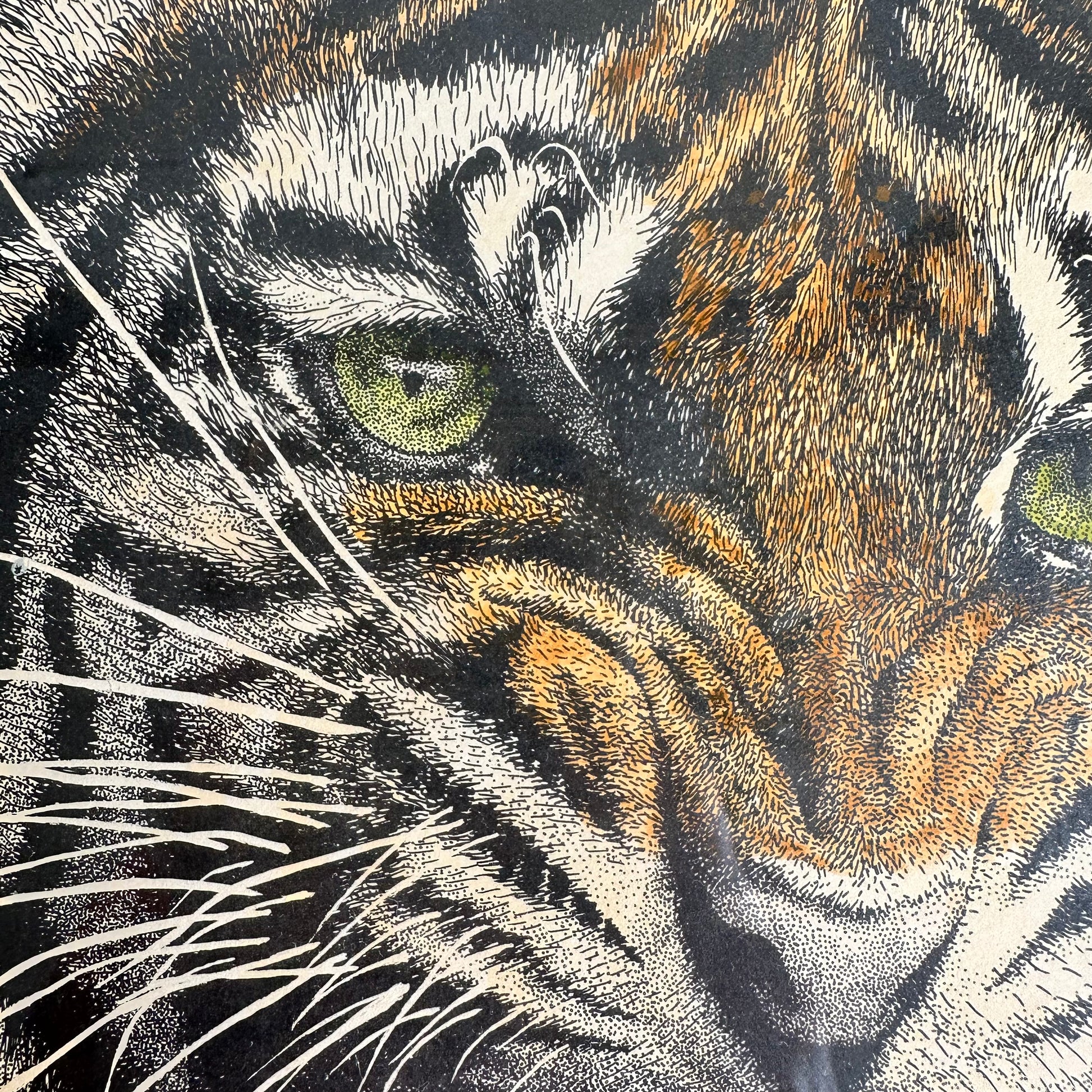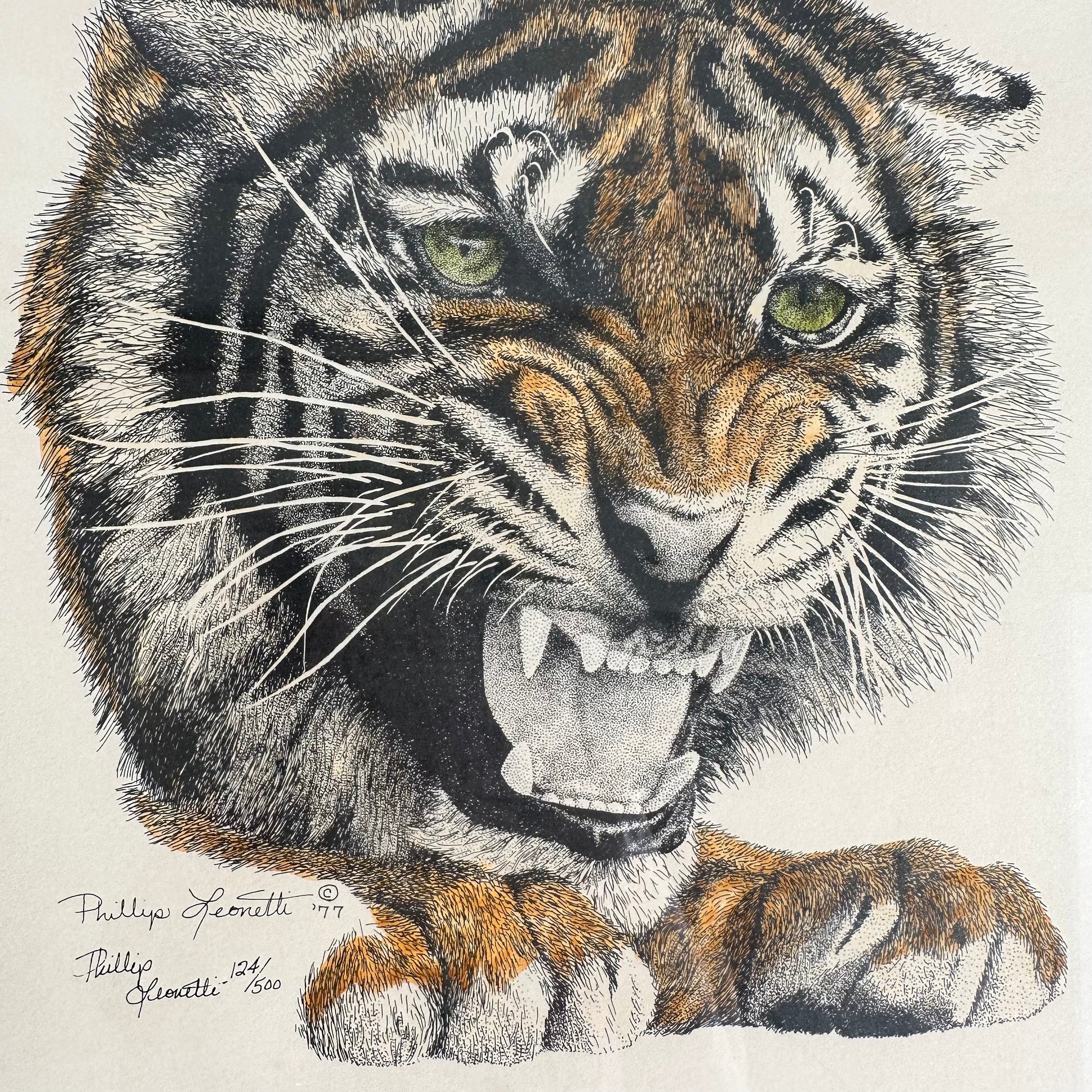 Framed + numbered Philip Leonetti original signed litho Tiger Print, from 1977. As you can see in the more detailed photos, his pen work creates a tiger’s fur that looks soft + touchable, which, from my own experience, is no easy feat. Expertly framed + ready for your wall.