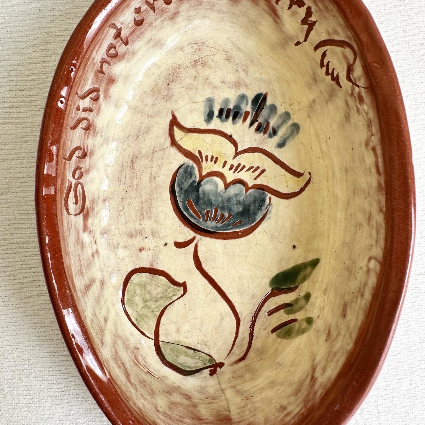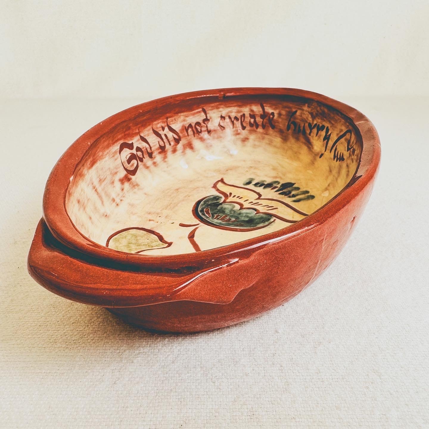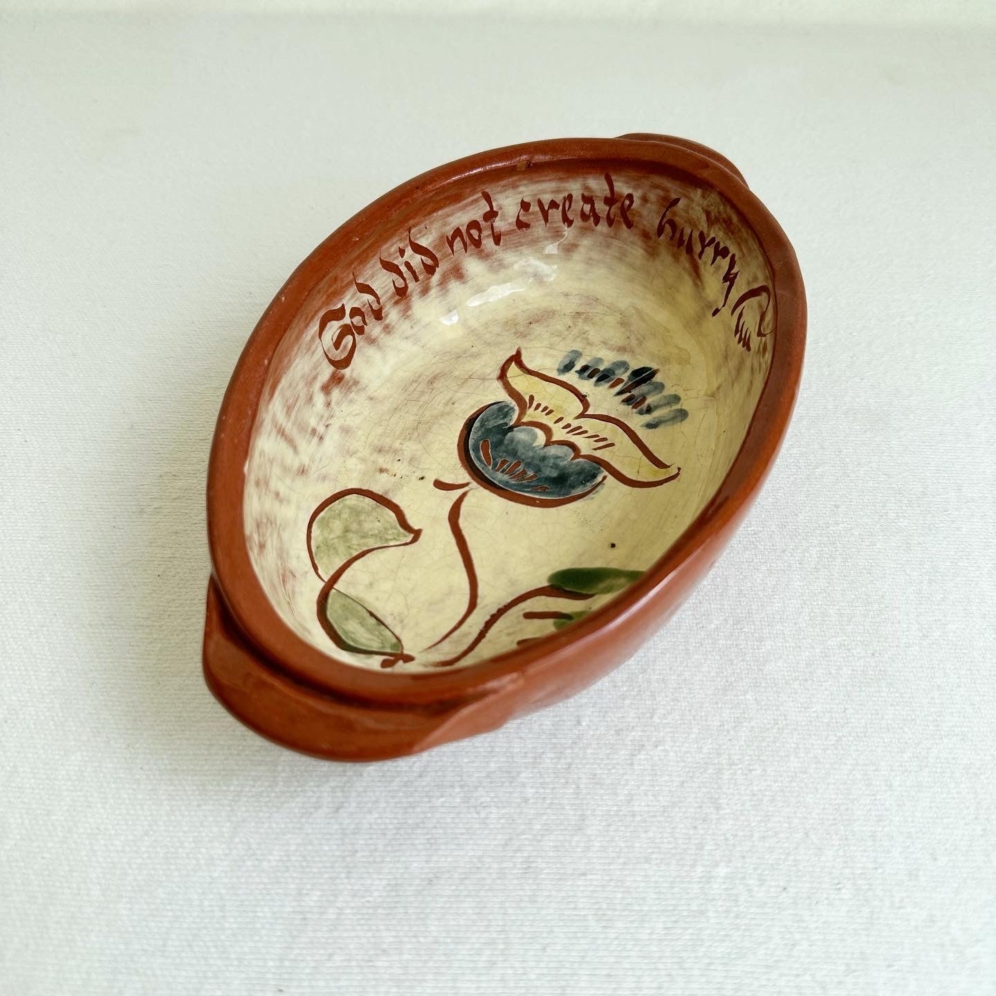 Handmade oval decorative pottery dish, painted + inscribed w: “God did not create hurry.”