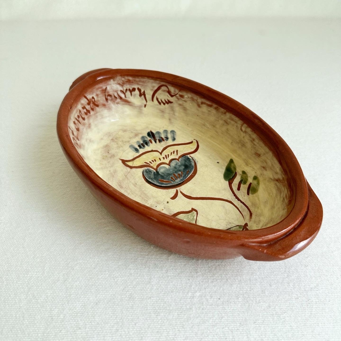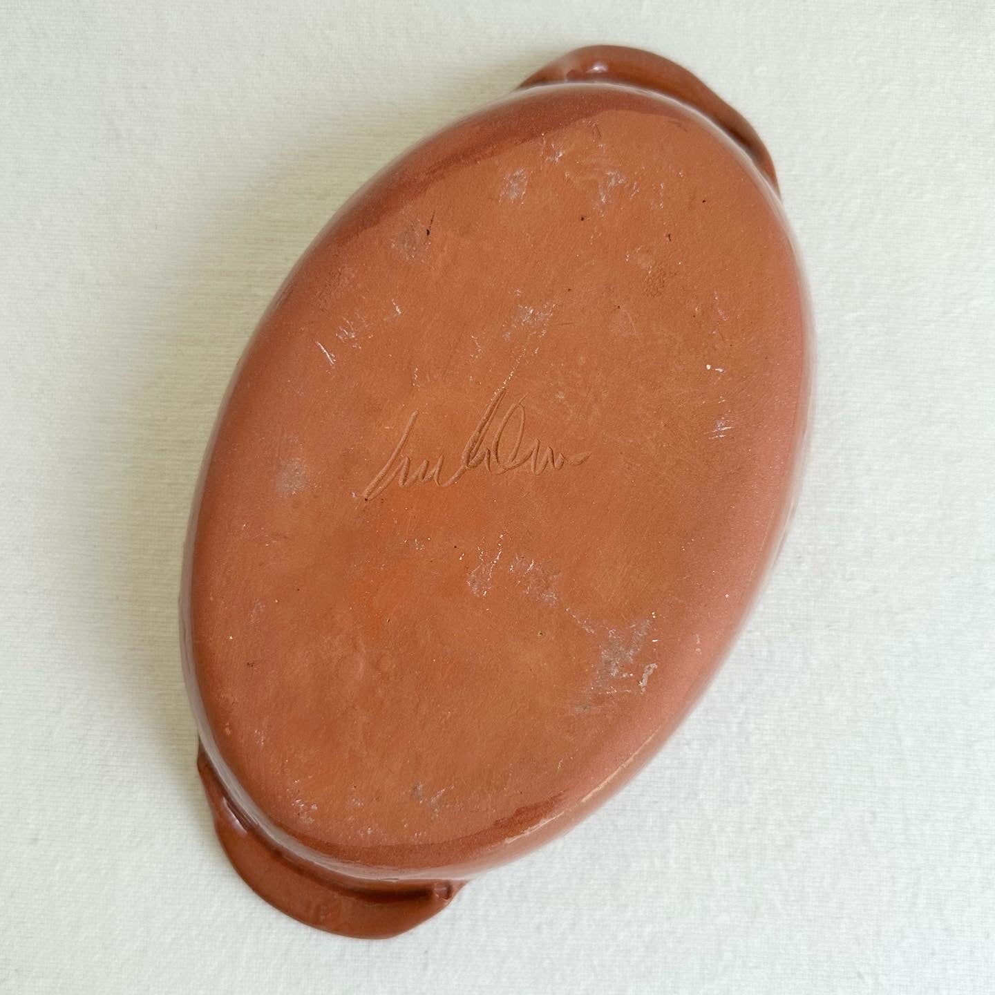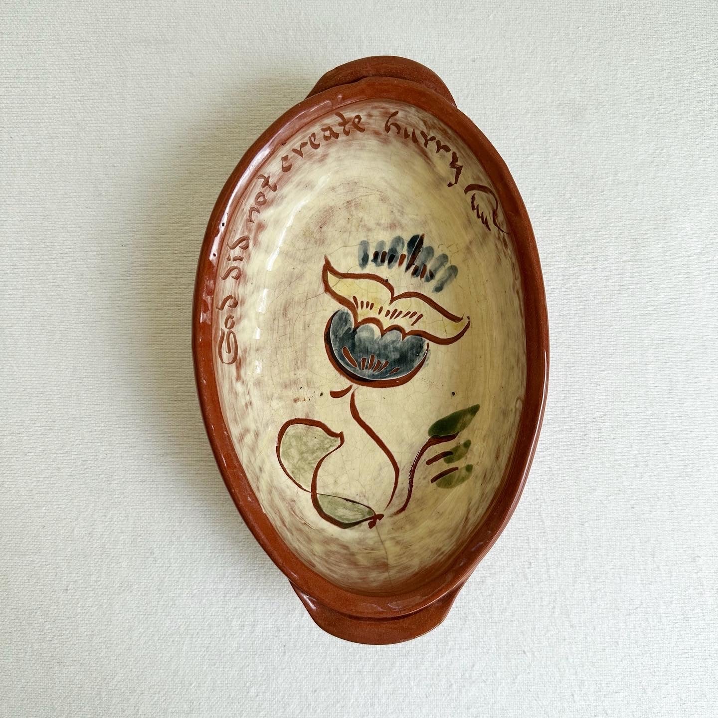 Handmade oval decorative pottery dish, painted + inscribed w: “God did not create hurry.”