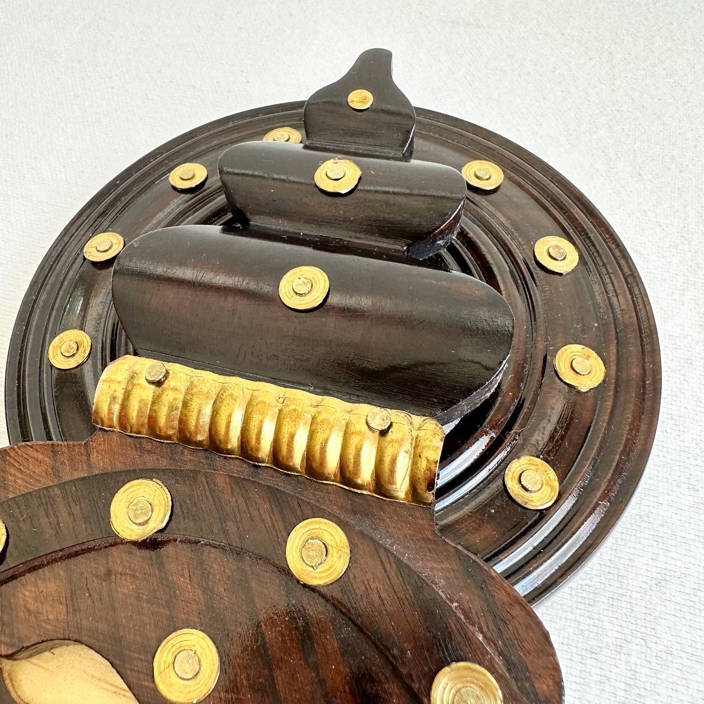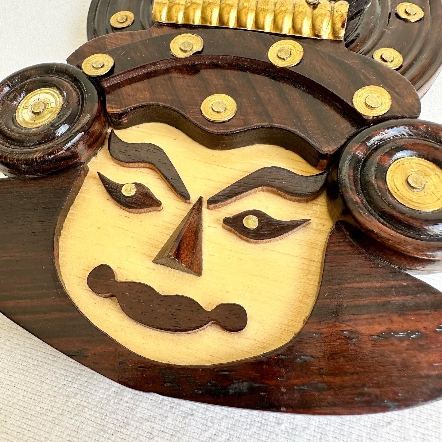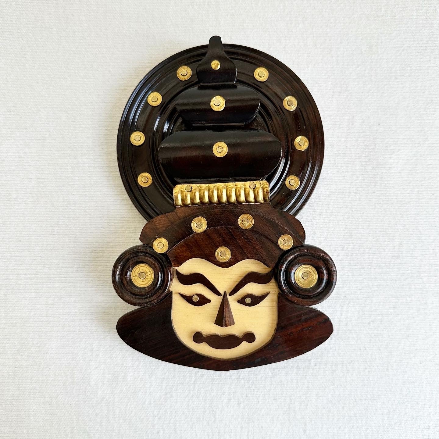 Hand carved wooden Kathakali mask decorative wall hanging. 12”T x 8”W. Exact name of this character could be Pachi or Pacha Vesham.