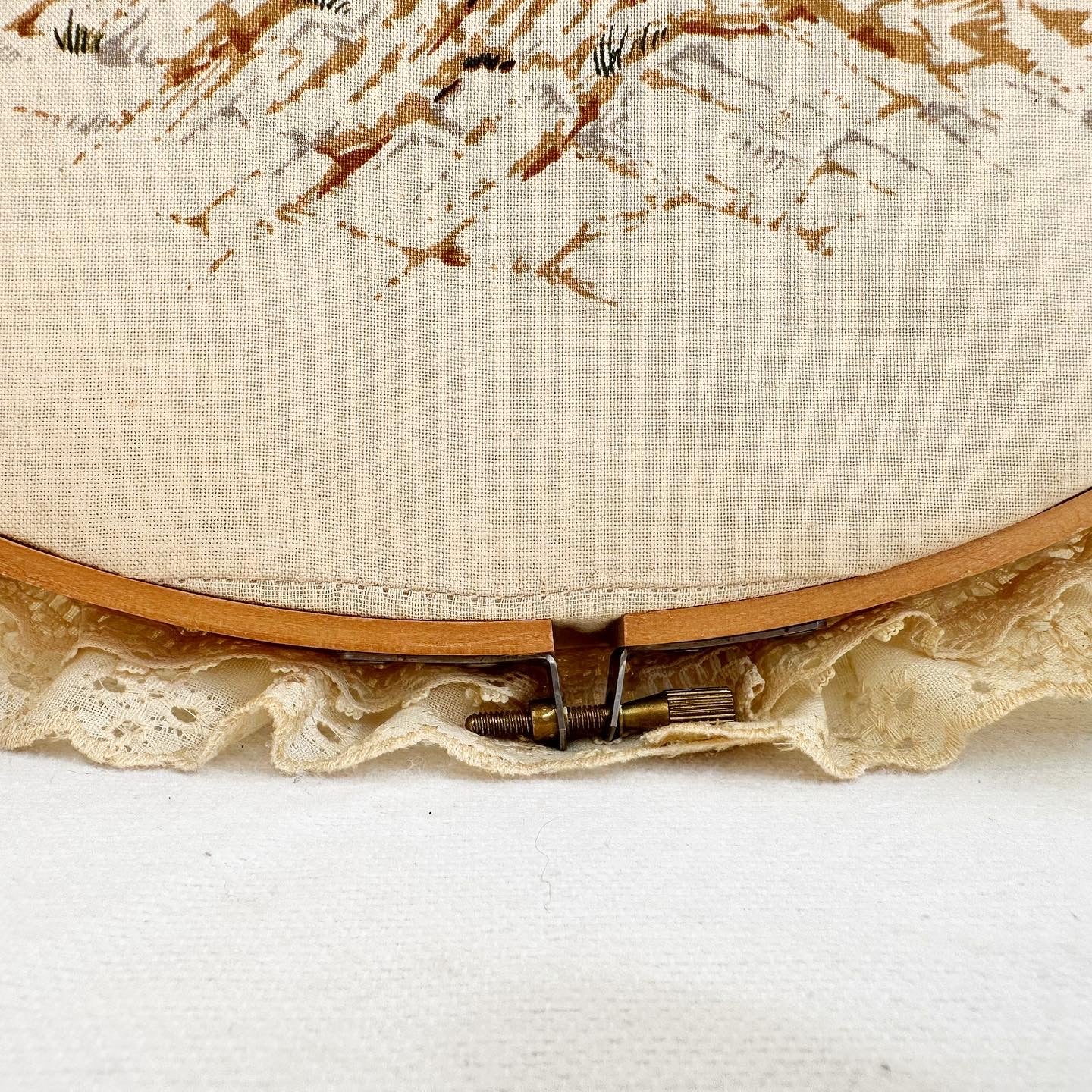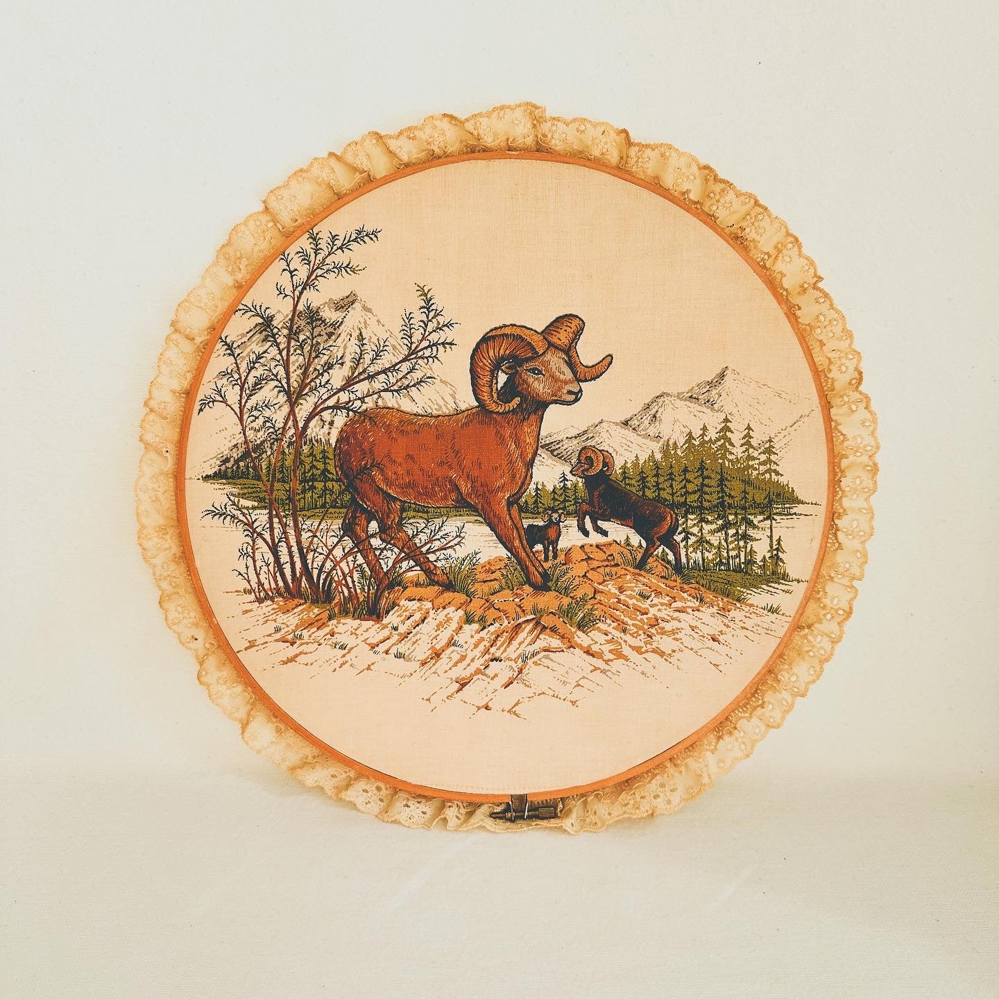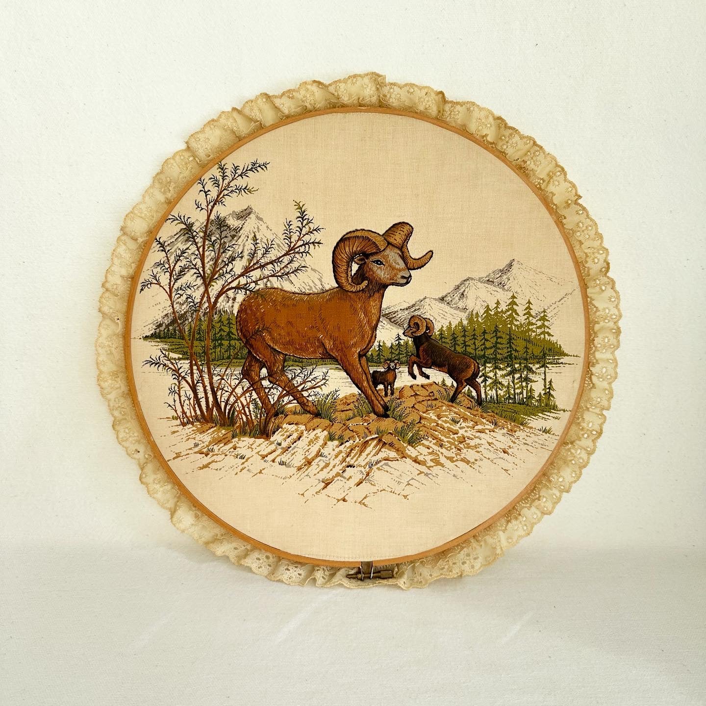Round raised texture textile art in an embroidery hoop of three rams. Tinted from age. 12.5”T inside hoop, 14” incl. lace.