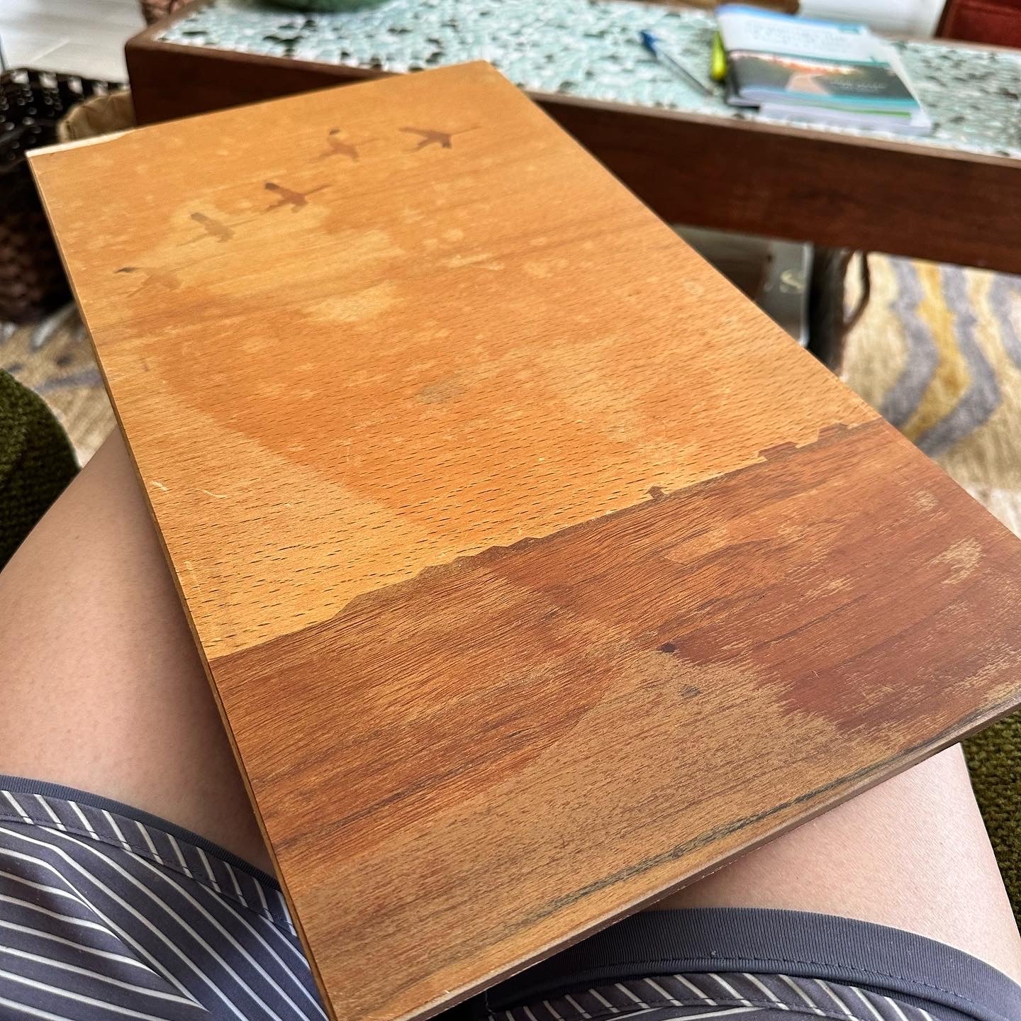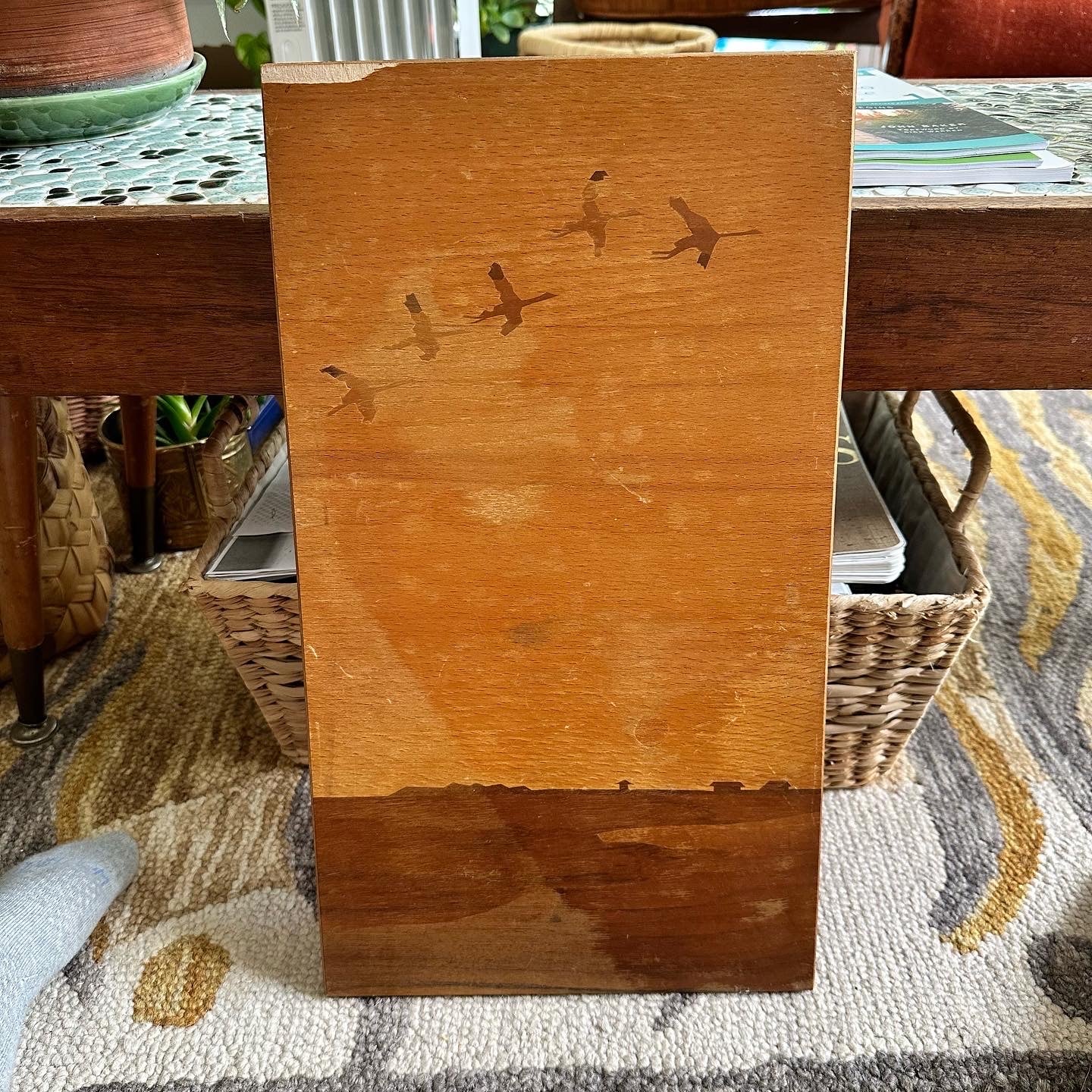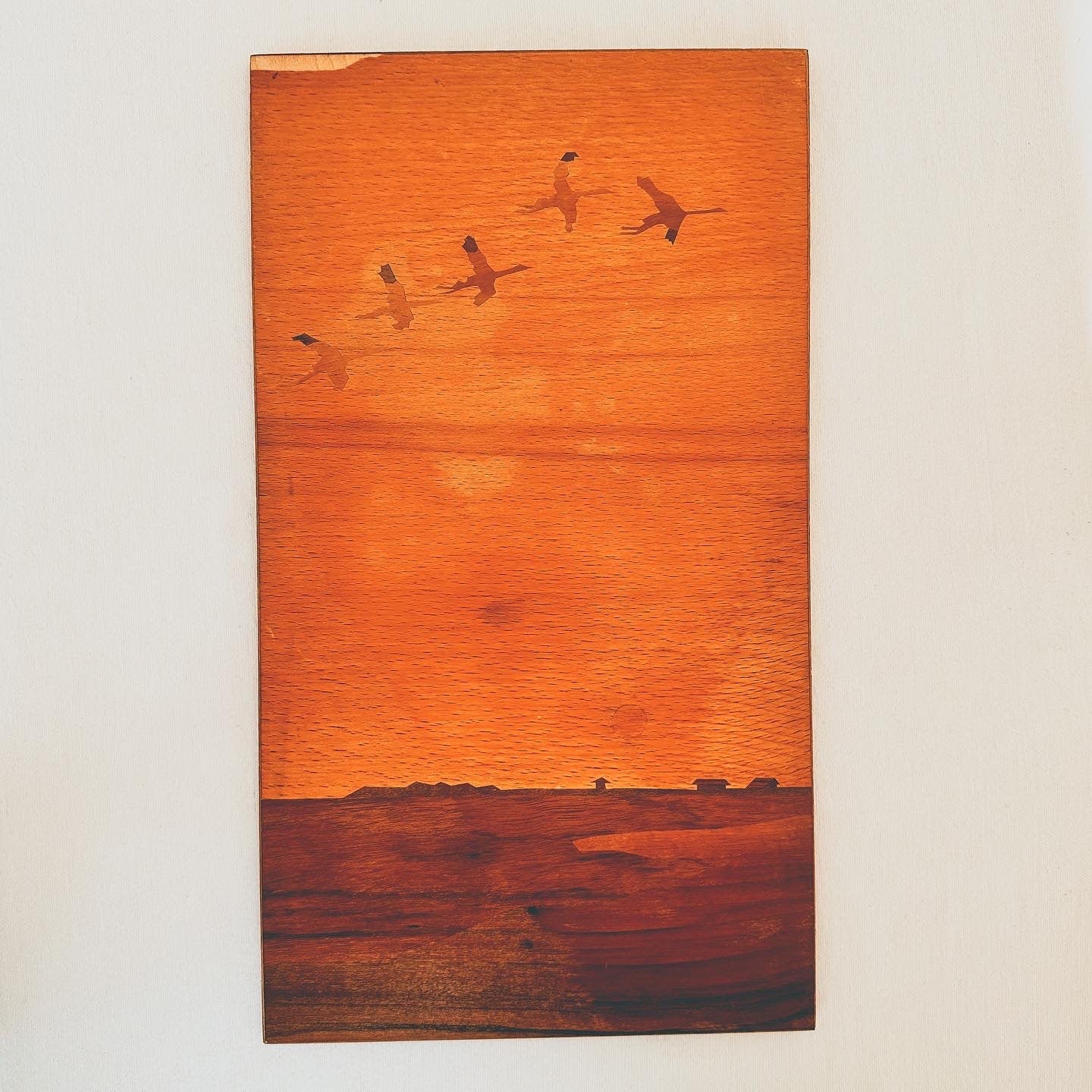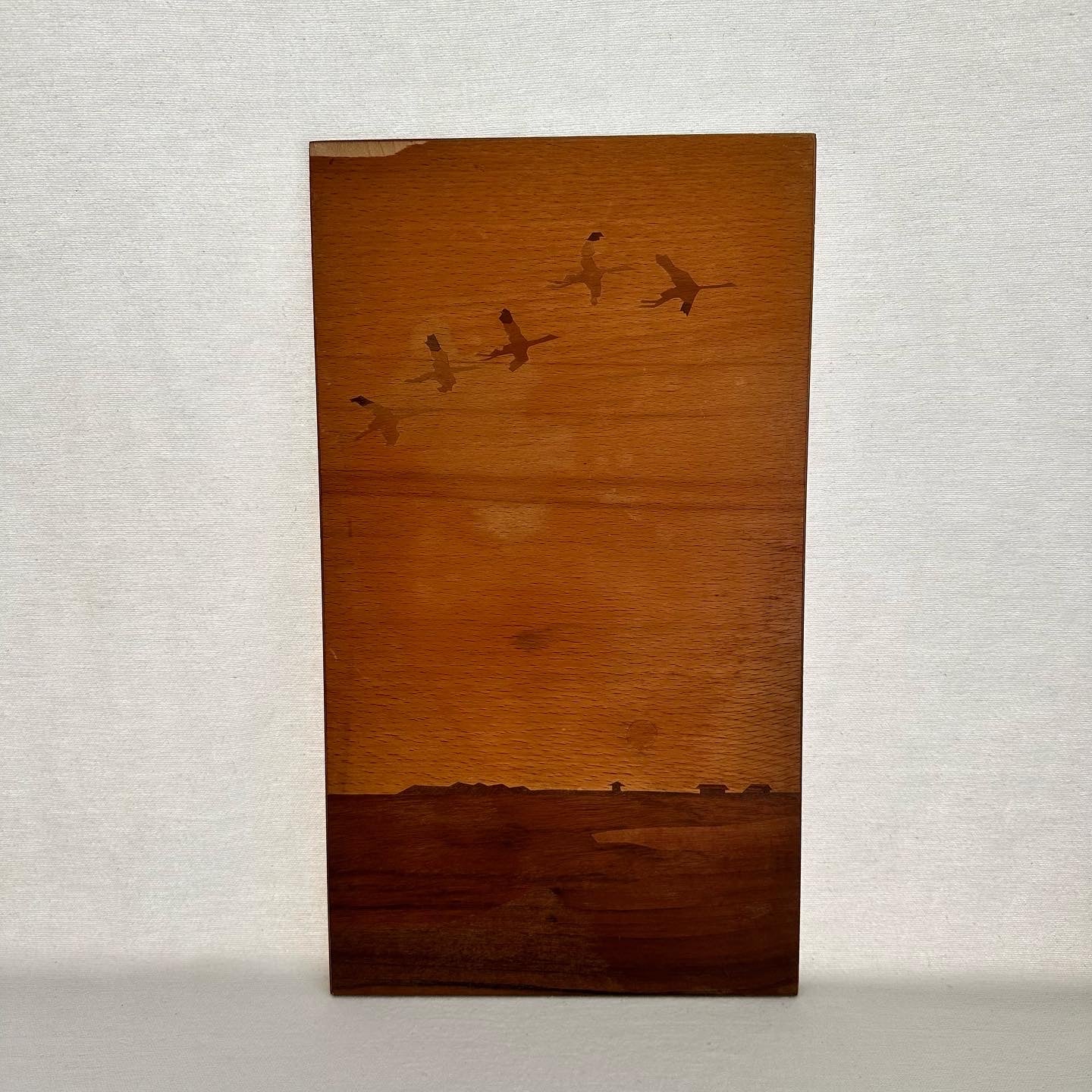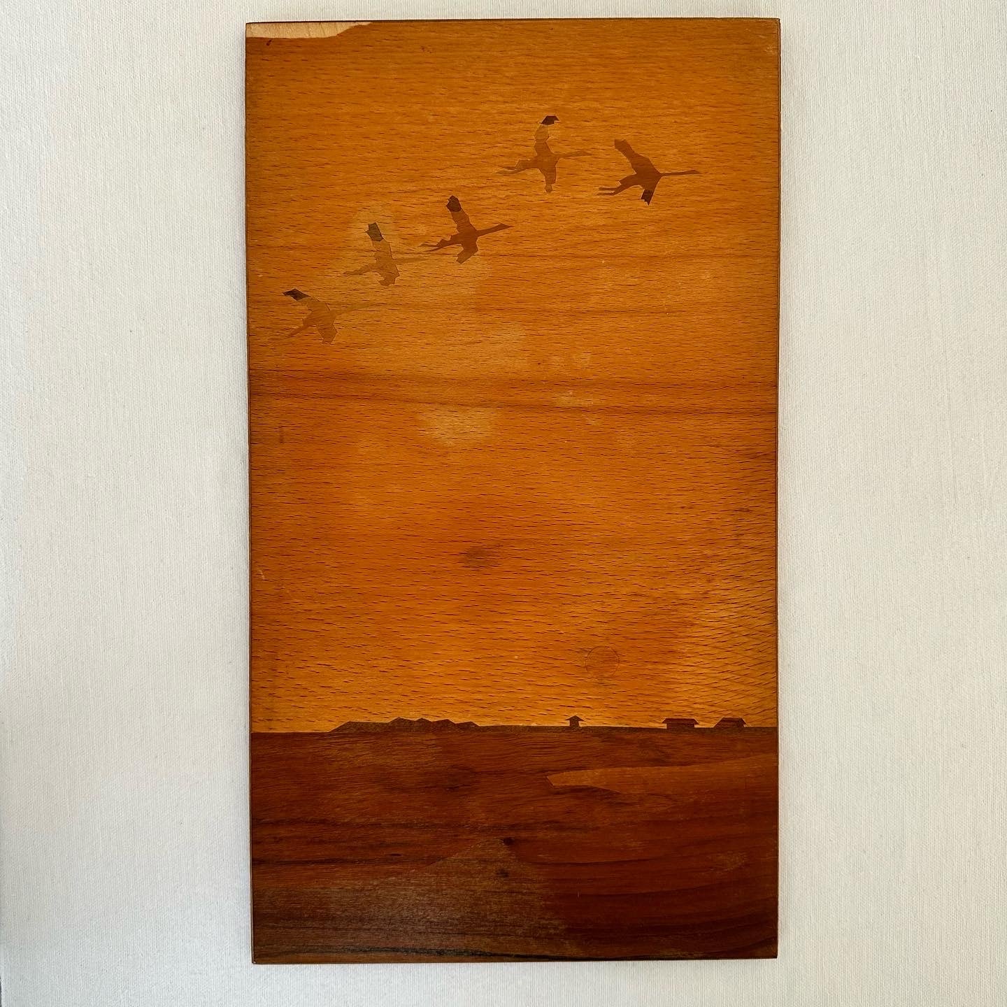 Russian marquetry piece of a simple scene. Beautifully made. It’s been polished, still has what might be water damage, as you can see.
