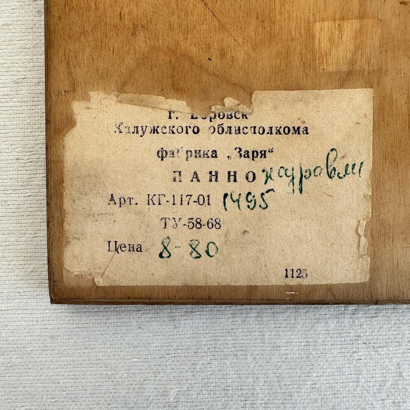 I tried my darndest to translate the back text: Kaluga Regional Executive Committee, factory “Zarya", Panel towards Art. KG-117-01 (495 direction) TU-58-68 Price: 8-80 1123. With more research, couldn’t find much, except that marquetry itself was very popular for a time (the use of veneers to create a flat piece).