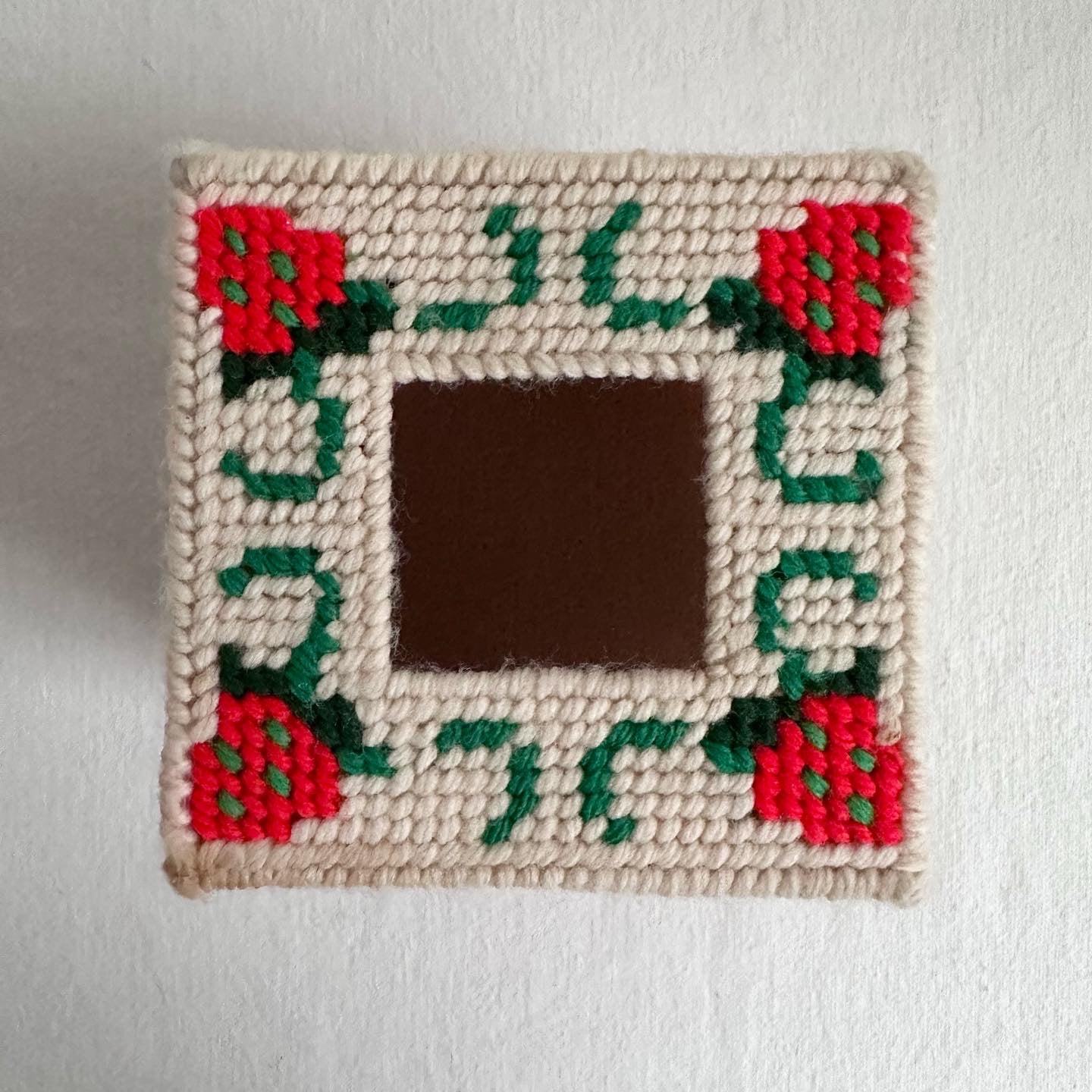 Handmade, yarn stitched tissue box cover w sweet lil’ strawberries all over. Good used condition. Slight break in the plastic grid seen in last pic.