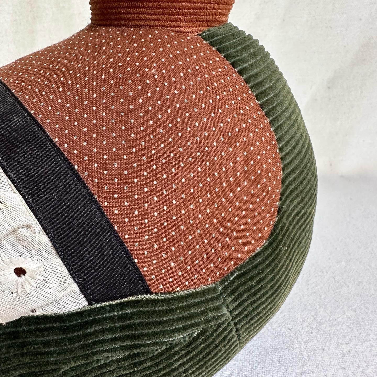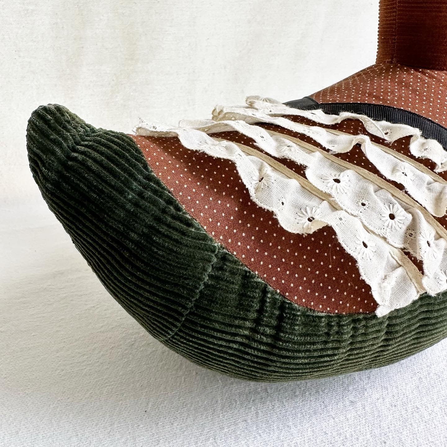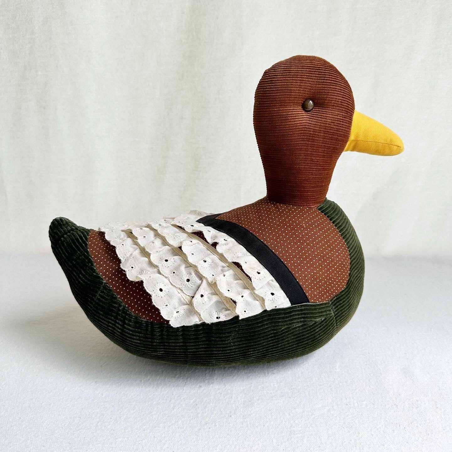Handmade stuffed duck. It’s so well made, it amazes me. The white eyelet ruffles have a little yellowing to them + its other eye is missing, but I’m on the lookout 👀. Almost 2 lbs. 11”L x 11”T.