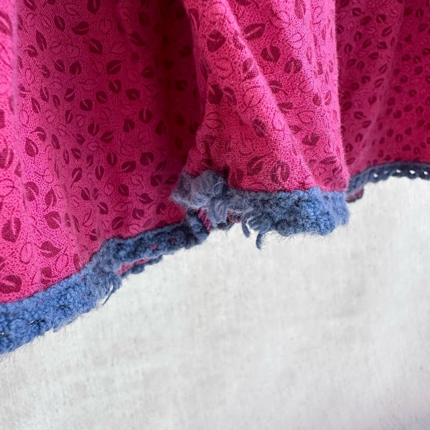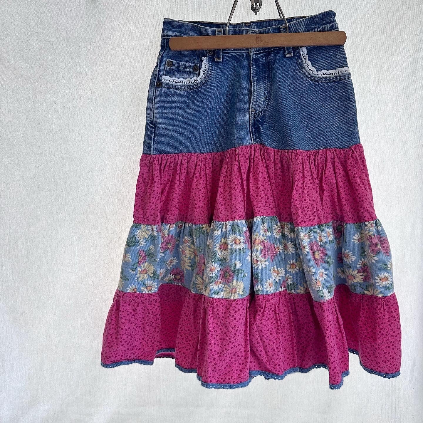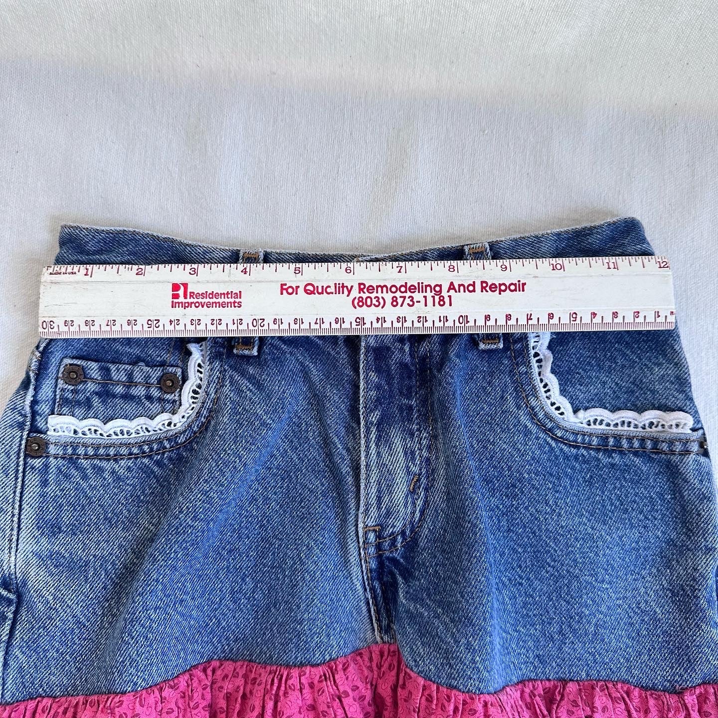 Upcycled pair of 569s = your new fav festival skirt. Waist: 22-23”. Length: 24”. One area of fraying shown.