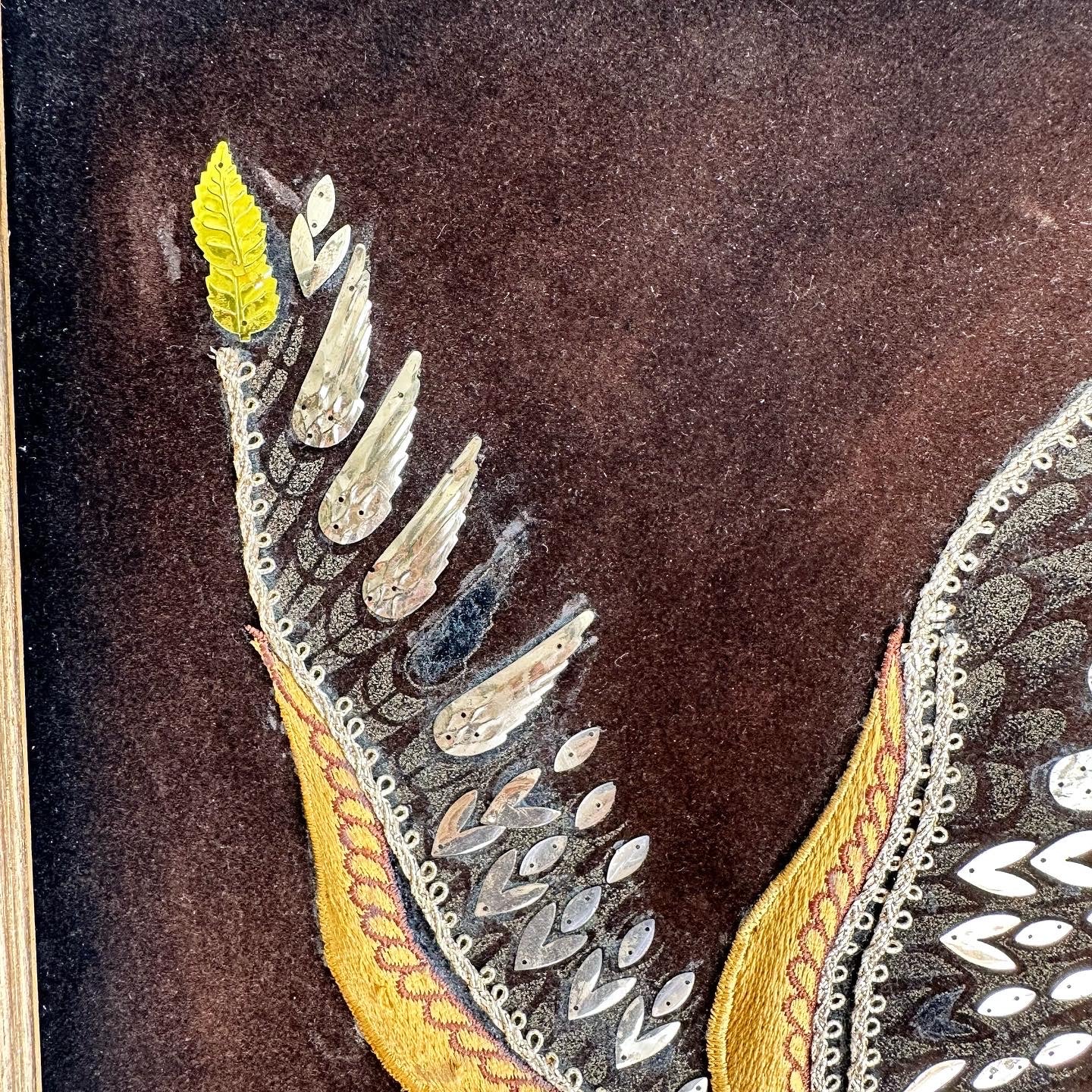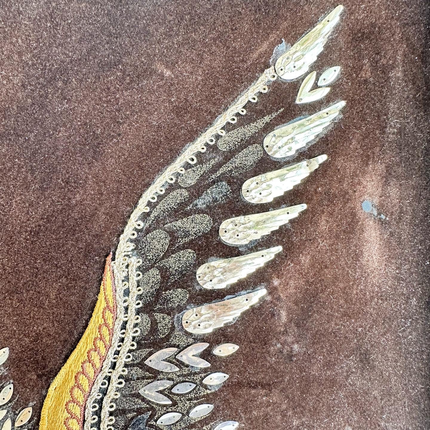 An exquisite example of DIY art from the 70s, this sequined eagle on brown velvet wall art is everything. Has wear + is missing original pieces, but that adds to its allure.