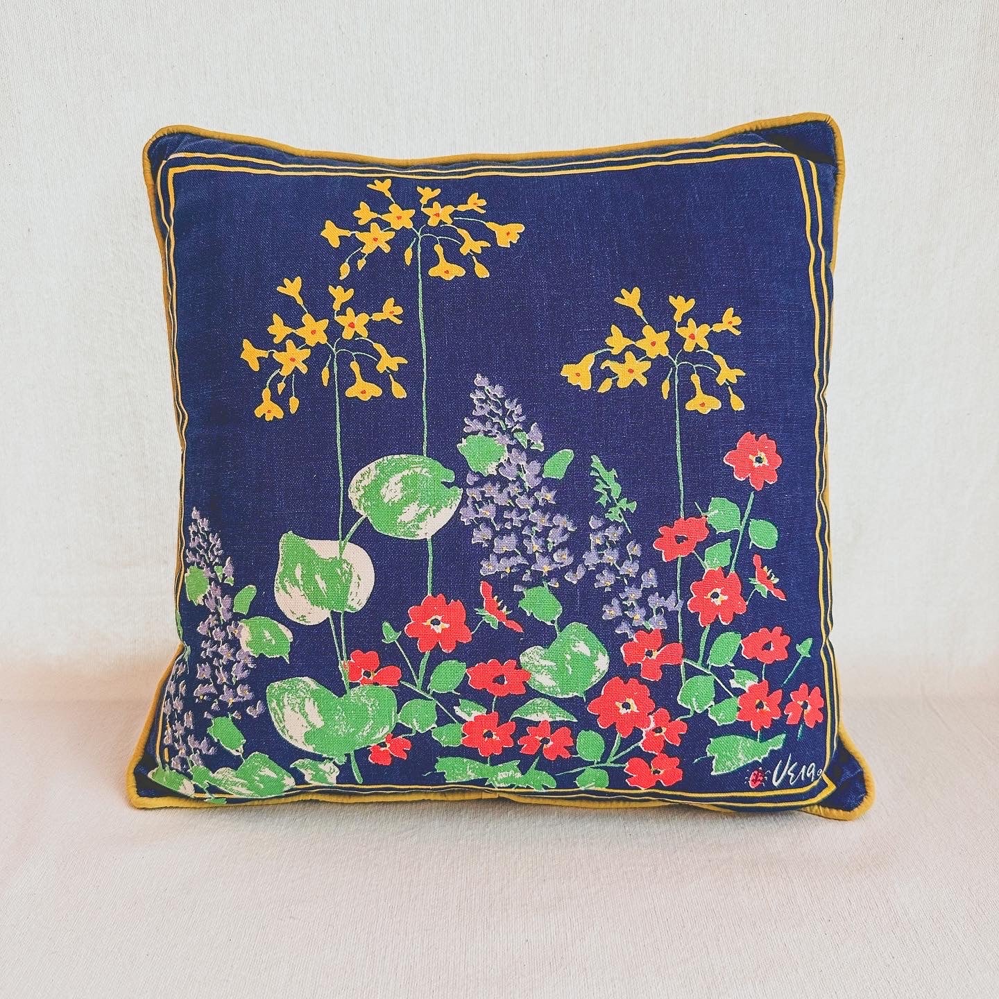 Stunning Vera Neumann throw pillow w flowers on a blue background + yellow piping, in perfect condition. Couldn’t find one for sale like it in all my searching, basically OOAK.