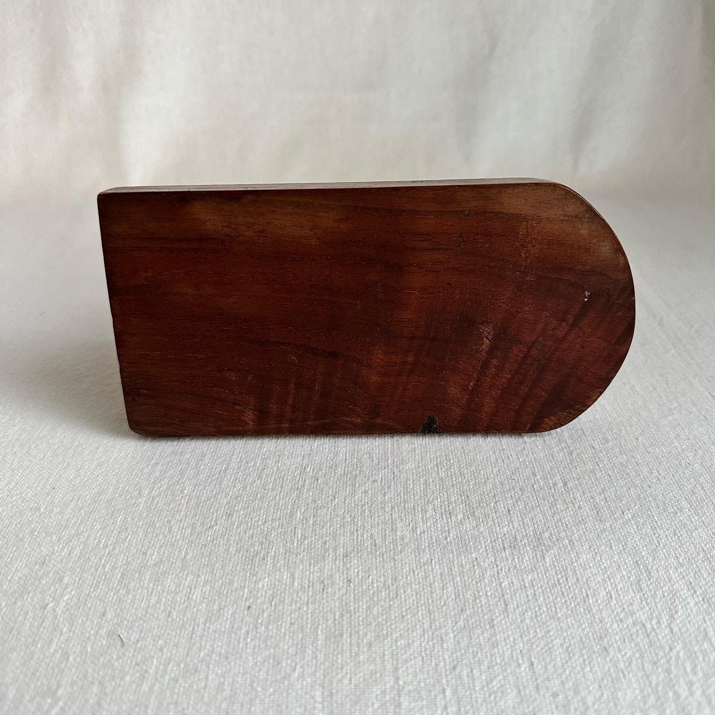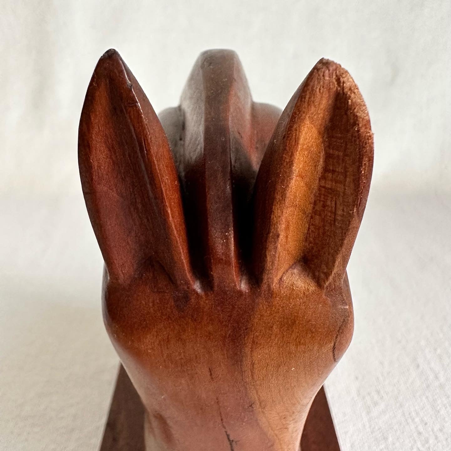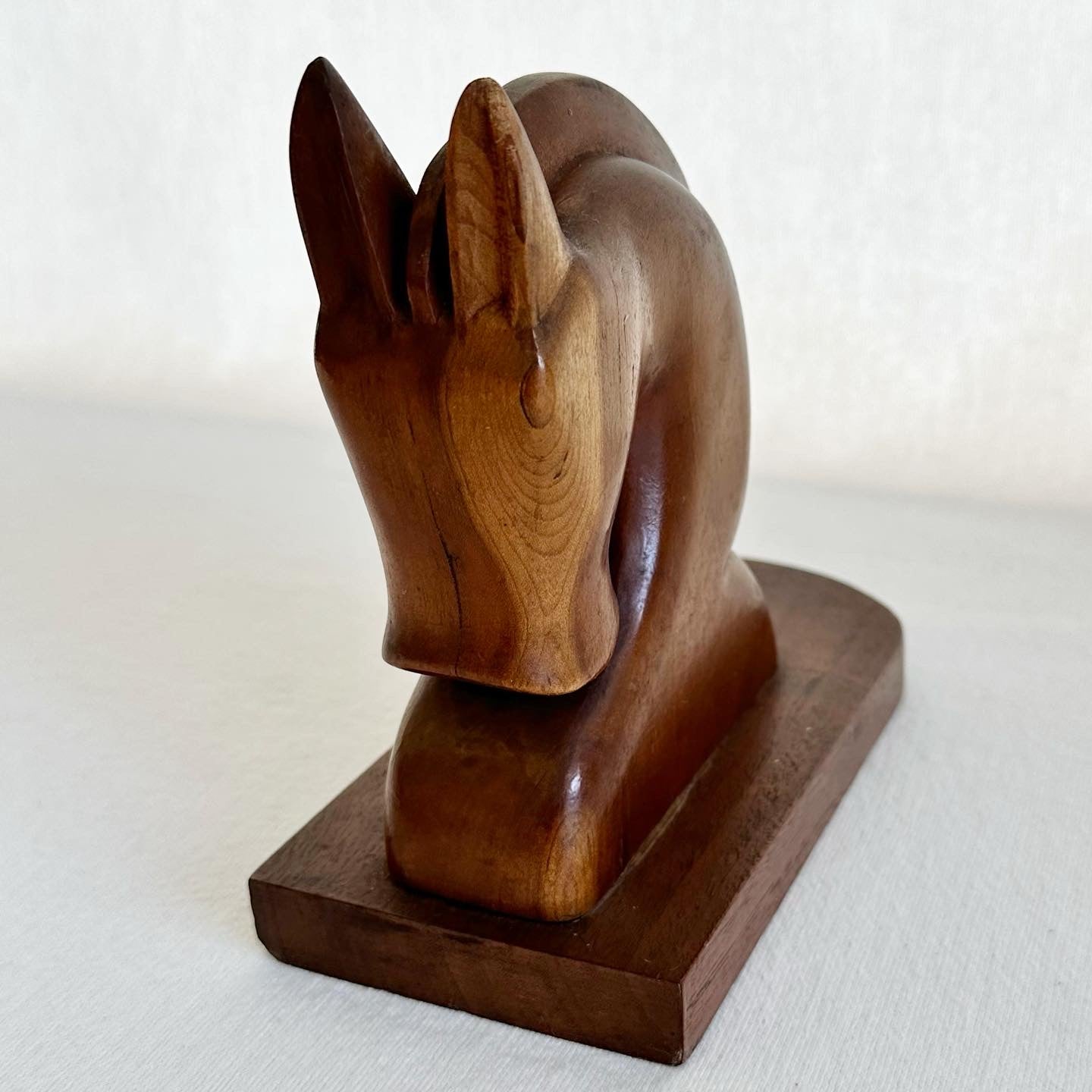 Solid wood horse head bookend. Love its modern curves + the simplicity of the mane. The coolest thing is the section of lighter wood around its right eye. His ears aren’t perfect, found it w the right ear broken. Did my best to sand it + clean it. 6.5”T x 3.5”W x 7”L.